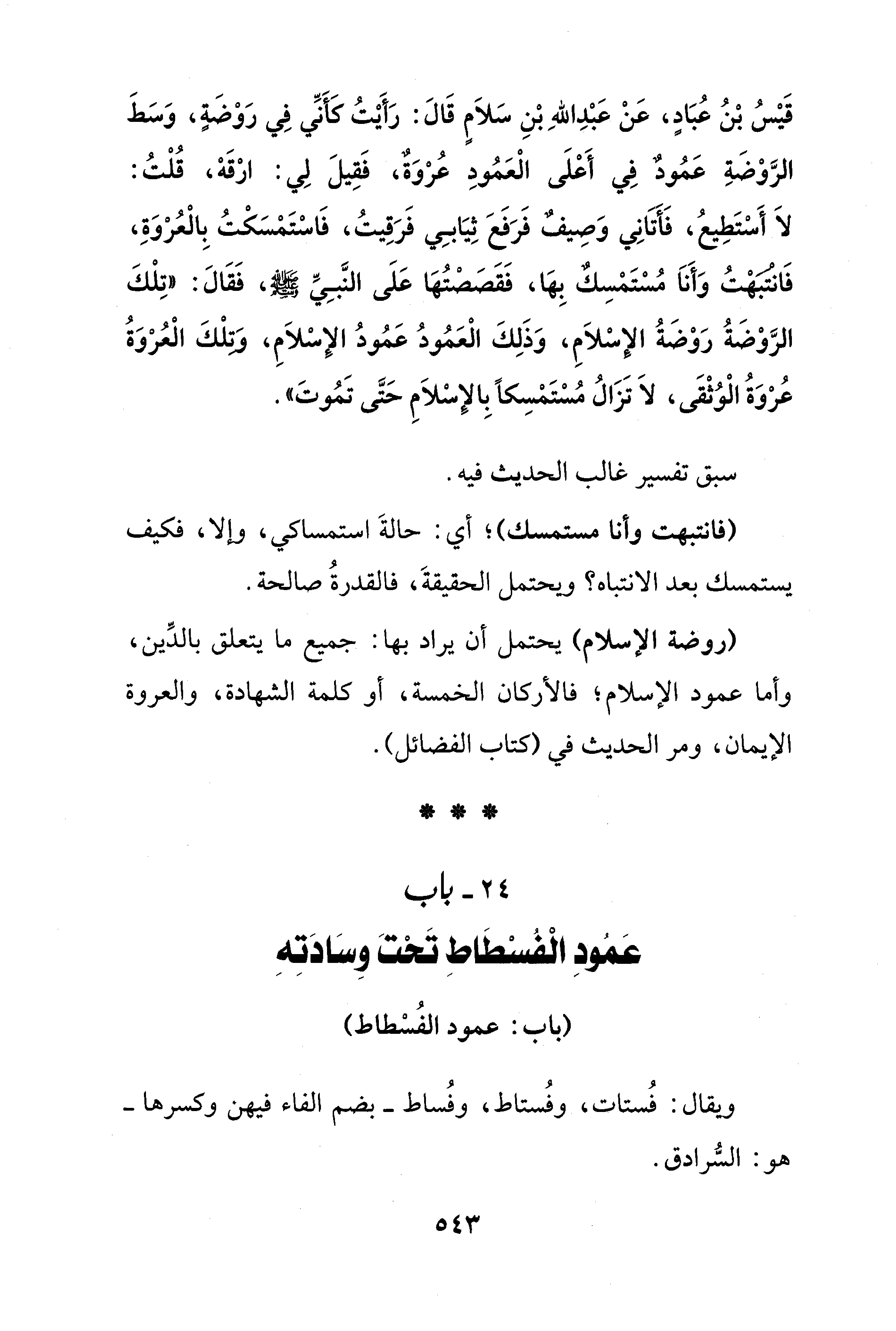 (روضة الإسلام) يحتمل أن يراد بها: جميع ما يتعلق بالدِّين، وأما عمود الإسلام؛ فالأركان الخمسة، أو كلمة الشهادة، والعروة الإيمان، ومر الحديث في (كتاب الفضائل).