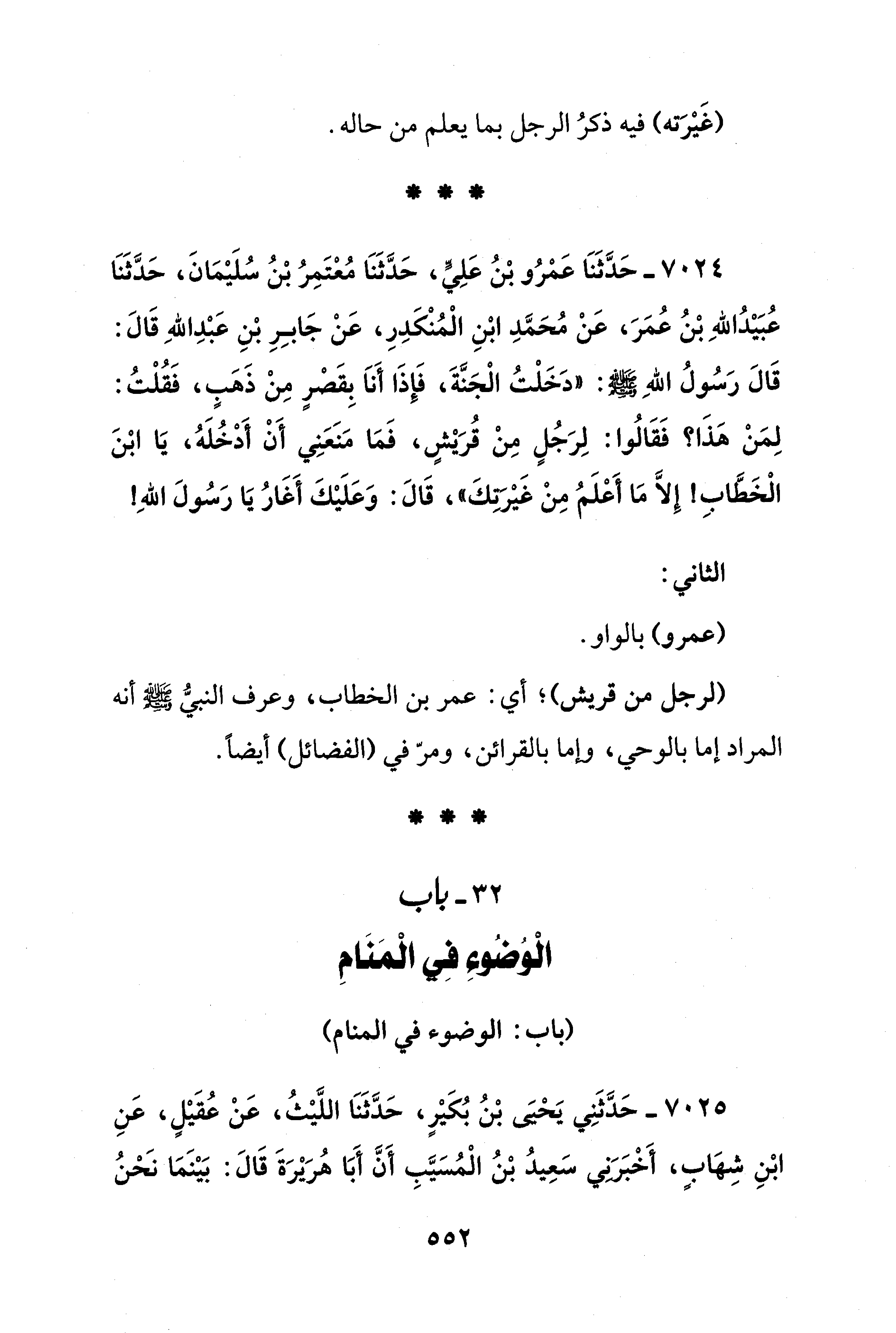 7024 - حَدَّثَنَا عَمْرُو بْنُ عَلِيٍّ، حَدَّثَنَا مُعْتَمِرُ بْنُ سُلَيْمَانَ، حَدَّثَنَا عُبَيْدُ اللهِ بْنُ عُمَرَ، عَنْ مُحَمَّدِ بْنِ الْمُنْكَدِرِ، عَنْ جَابِرِ بْنِ عَبْدِ اللهِ قَالَ: قَالَ رَسُولُ اللهِ - صلى الله عليه وسلم -: "دَخَلْتُ الْجَنَّةَ، فَإِذَا أَنَا بِقَصْرٍ مِنْ ذَهَبٍ، فَقُلْتُ: لِمَنْ هَذَا؟ فَقَالُوا: لِرَجُلٍ مِنْ قُرَيْشٍ، فَمَا مَنَعَنِي أَنْ أَدْخُلَهُ، يَا ابْنَ الْخَطَابِ! إِلَّا مَا أَعْلَمُ مِنْ غَيْرَتِكَ"، قَالَ: وَعَلَيْكَ أَغَارُ يَا رَسُولَ اللهِ!