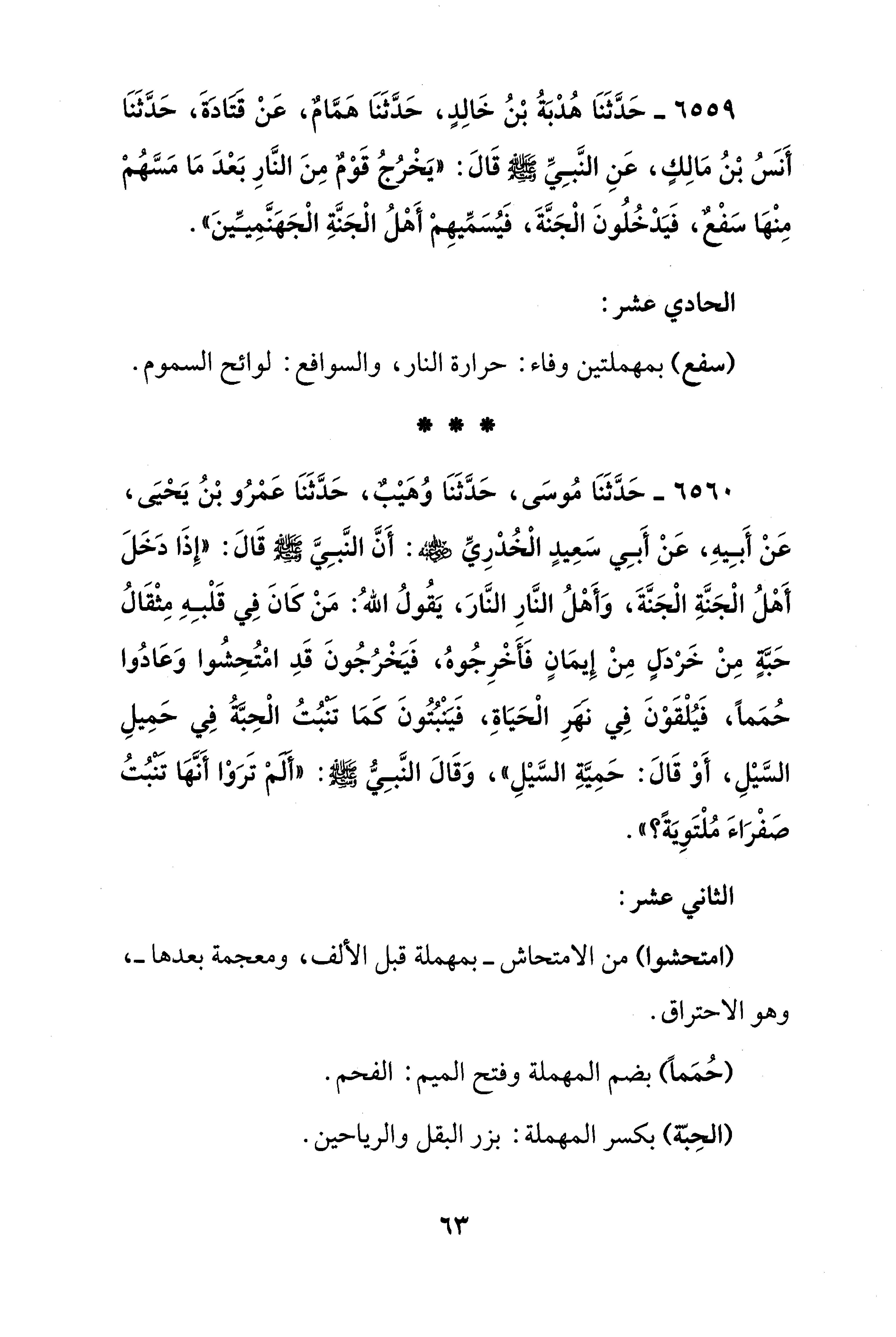 6559 - حَدَّثَنَا هُدْبَةُ بْنُ خَالِدٍ، حَدَّثَنَا هَمَّامٌ، عَنْ قتادَةَ، حَدَّثَنَا أَنسُ بْنُ مَالِكٍ، عَنِ النَّبِيِّ - صلى الله عليه وسلم - قَالَ: "يَخْرُجُ قَوْمٌ مِنَ النَّارِ بَعْدَ مَا مَسَّهُمْ مِنْهَا سَفْعٌ، فَيَدْخُلُونَ الْجَنَّةَ، فَيُسَمِّيهِمْ أَهْلُ الْجَنَّةِ الْجَهَنَّمِيِّينَ".