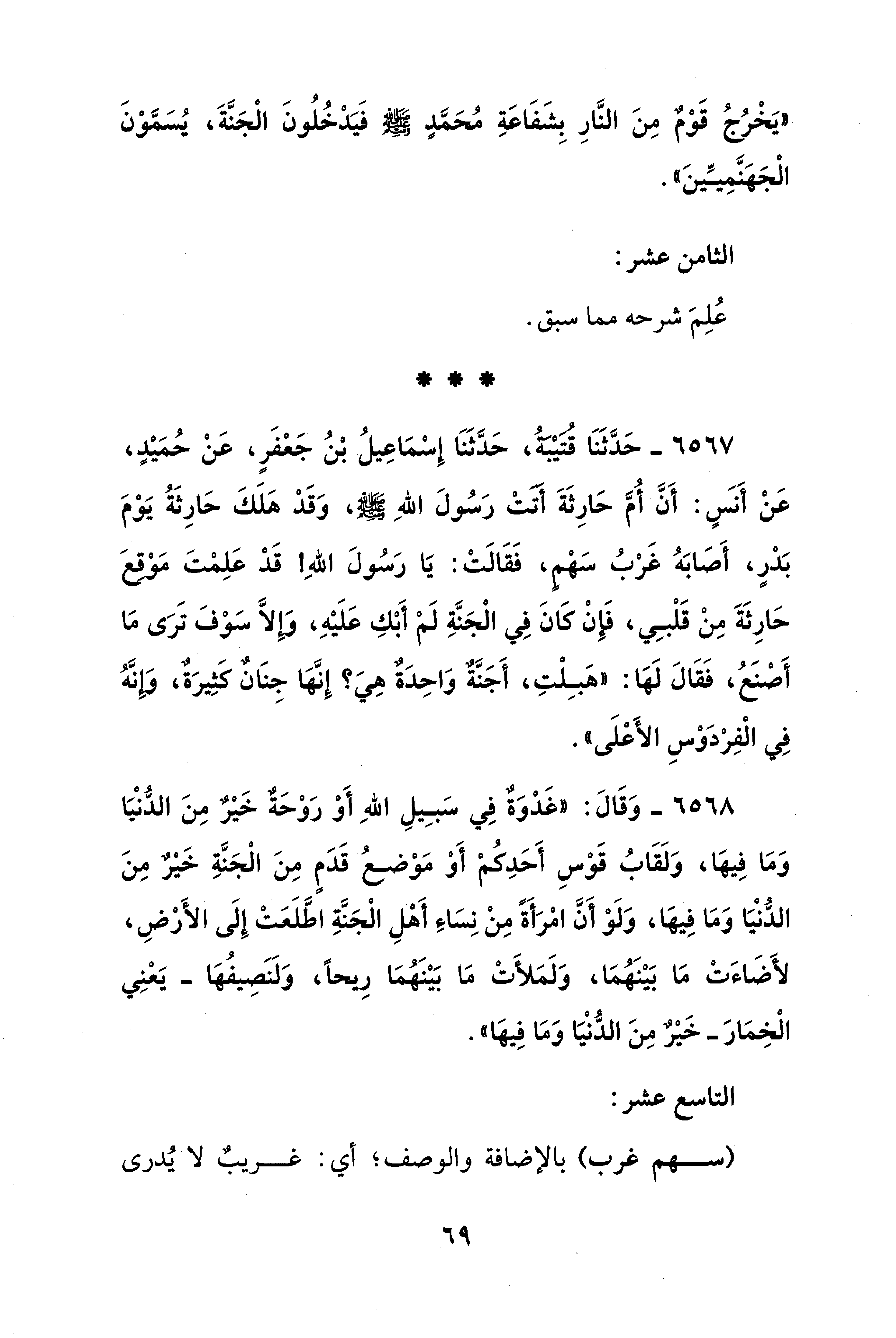 6567 - حَدَّثَنَا قتيْبَةُ، حَدَّثَنَا إِسْمَاعِيلُ بْنُ جَعْفَرٍ، عَنْ حُمَيْدٍ، عَنْ أَنسٍ: أَنَّ أُمَّ حَارِثَةَ أَتَتْ رَسُولَ اللهِ - صلى الله عليه وسلم -، وَقَدْ هَلَكَ حَارِثَةُ يَوْمَ بَدْرٍ، أَصَابَهُ غَرْبُ سَهْمٍ، فَقَالَتْ: يَا رَسُولَ اللهِ! قَدْ عَلِمْتَ مَوْقِعَ حَارِثَةَ مِنْ قَلْبِي، فَإِنْ كَانَ فِي الْجَنَّةِ لَمْ أَبْكِ عَلَيْهِ، وَإِلَّا سَوْفَ تَرَى مَا أَصْنَعُ، فَقَالَ لَهَا: "هَبِلْتِ، أَجَنَّةٌ وَاحِدَةٌ هِيَ؟ إِنَّهَا جِنَان كَثِيرَةٌ، وَإِنَّهُ فِي الْفِرْدَوْسِ الأَعْلَى".
