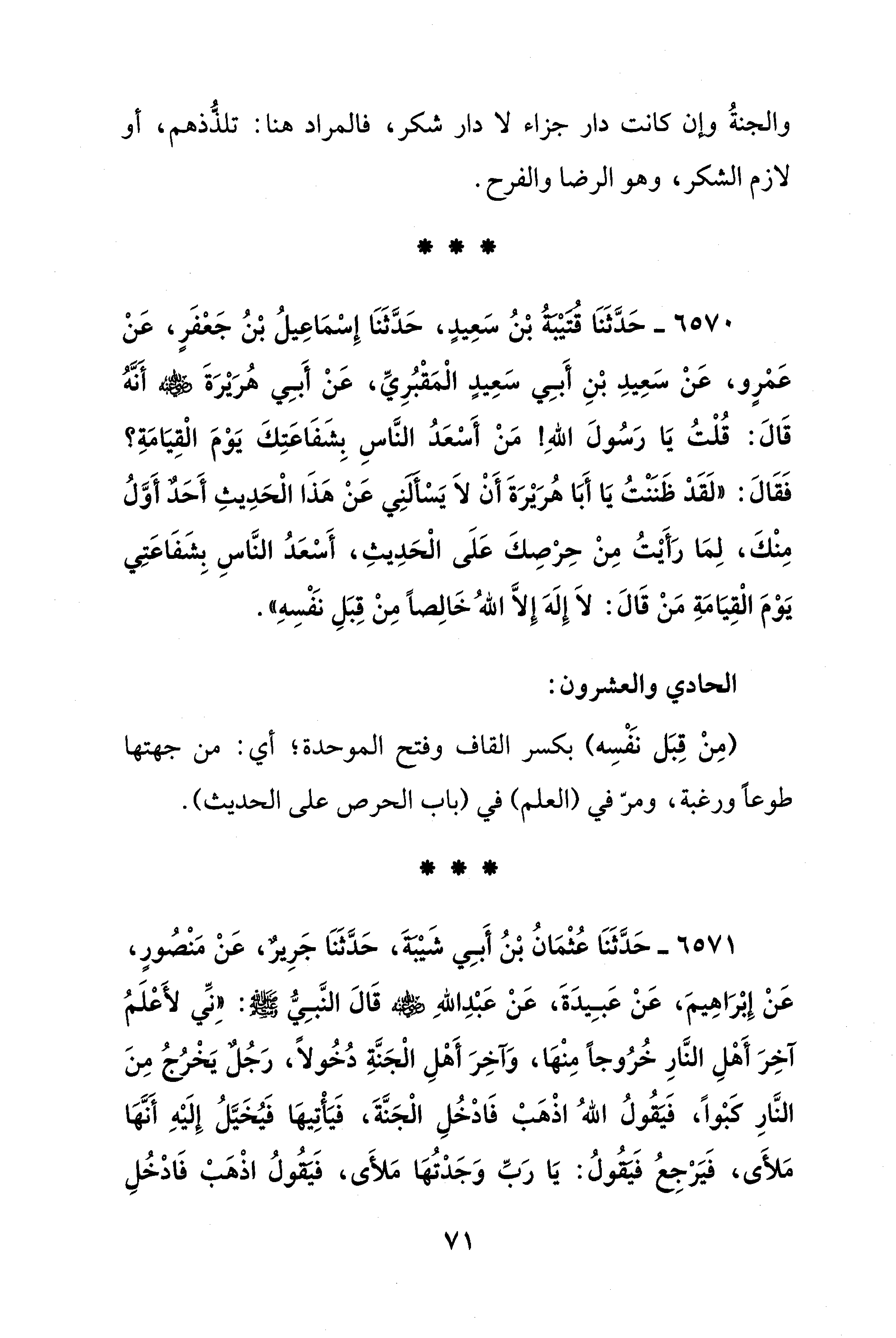 6571 - حَدَّثَنَا عُثْمَانُ بْنُ أَبِي شَيْبَةَ، حَدَّثَنَا جَرِيرٌ، عَنْ مَنْصُورٍ، عَنْ إِبْرَاهِيمَ، عَنْ عَبِيدَةَ، عَنْ عَبْدِ اللهِ - رضي الله عنه - قَالَ النَّبِيُّ - صلى الله عليه وسلم -: "إِنِّي لأَعْلَمُ آخِرَ أَهْلِ النَّارِ خُرُوجًا مِنْهَا، وَآخِرَ أَهْلِ الْجَنَّةِ دُخُولًا، رَجُلٌ يَخْرُجُ مِنَ النَّارِ كَبْوًا، فَيَقُولُ اللهُ اذْهَبْ فَادْخُلِ الْجَنَّةَ، فَيَأْتِيهَا فَيُخَيَّلُ إِلَيْهِ أنَّهَا مَلأَى، فَيَرْجِعُ فَيَقُولُ: يَا رَبِّ وَجَدْتُهَا مَلأَى، فَيَقُولُ اذْهَبْ فَادْخُلِ