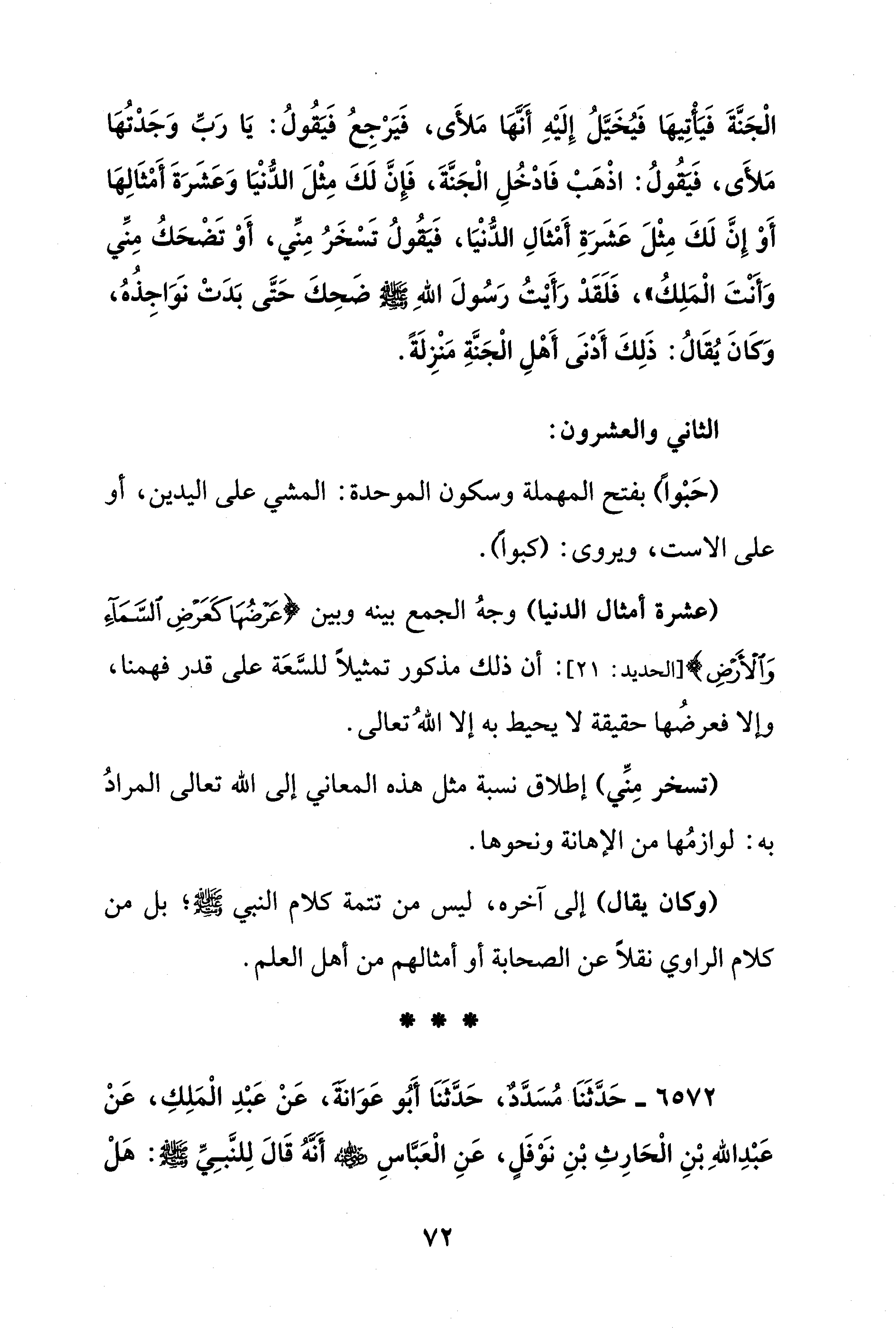 6572 - حَدَّثَنَا مُسَدَّدٌ، حَدَّثَنَا أَبُو عَوَانَةَ، عَنْ عَبْدِ الْمَلِكِ، عَنْ عَبْدِ اللهِ بْنِ الْحَارِثِ بْنِ نوفَلٍ، عَنِ الْعَبَّاسِ - رضي الله عنه - أَنَّهُ قَالَ لِلنَّبِيِّ - صلى الله عليه وسلم -: هَلْ
