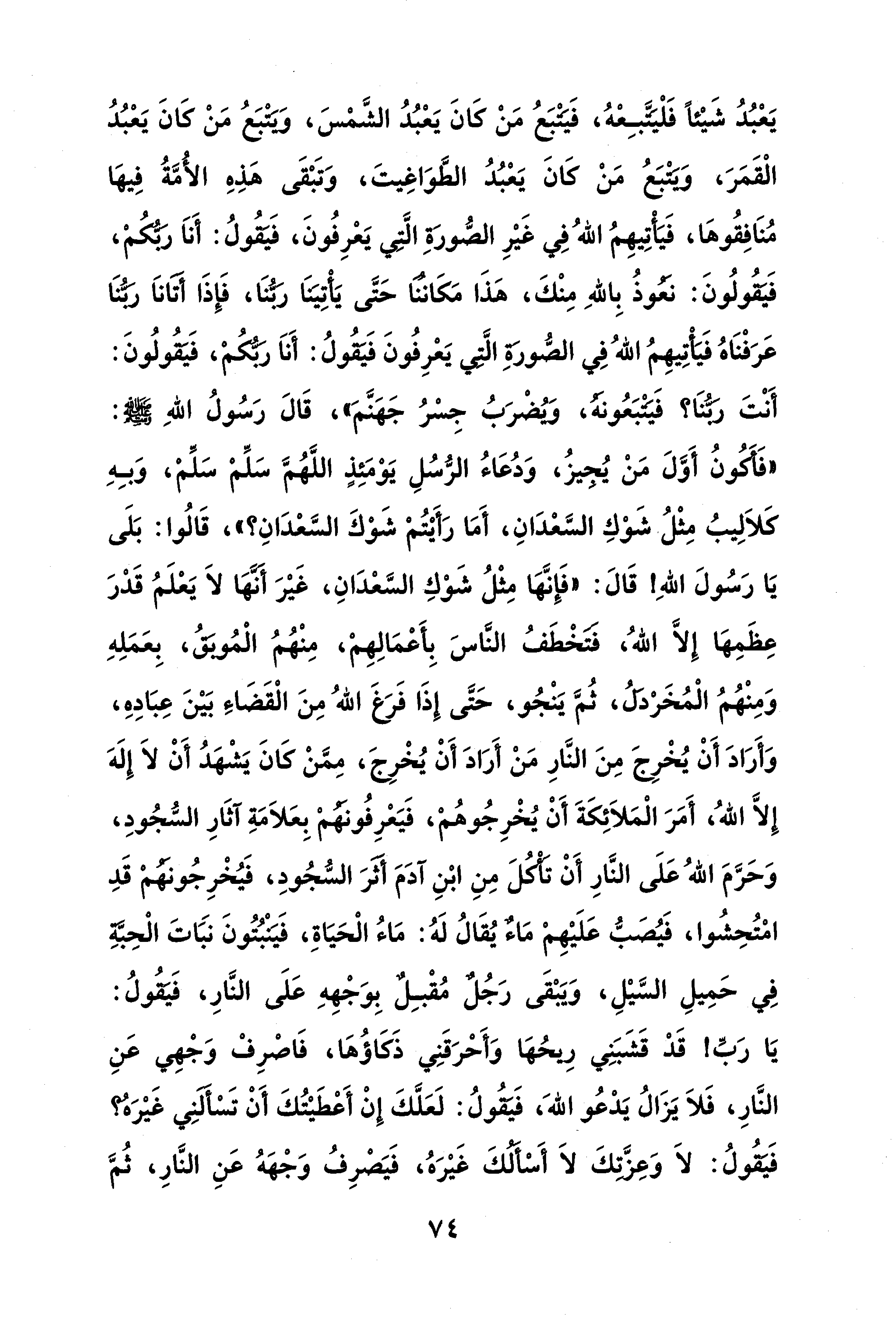 يَعْبُدُ شَيْئًا فَلْيَتَّبِعْهُ، فَيَمَنْ كَانَ يَعْبُدُ الشَّمْسَ، وَيَتْبَعُ مَنْ كَانَ يَعْبُدُ الْقَمَرَ، وَيَتْبَعُ مَنْ كَانَ يَعْبُدُ الطَّوَاغِيتَ، وَتَبْقَى هَذِهِ الأُمَّةُ فِيهَا مُنَافِقُوهَا، فَيَأْتِيهِمُ اللهُ فِي غَيْرِ الصُّورَةِ الَّتِي يَعْرِفُونَ، فَيَقُولُ: أَنَا رَبُّكُمْ، فَيَقُولُونَ: نَعُوذُ بِاللهِ مِنْكَ، هَذَا مَكَانُنَا حَتَّى يَأْتِيَنَا ربُّنَا، فَإِذَا أتانَا ربُّنَا عَرَفْنَاهُ فَيَأْتِيهِمُ اللهُ فِي الصُّورَةِ الَّتِي يَعْرِفُونَ فَيَقُولُ: أَنَا رَبُّكُمْ، فَيَقُولُونَ: أَنْتَ ربُّنَا؟ فَيَتْبَعُونَهُ، وَيُضْرَبُ جِسْرُ جَهَنَّمَ"، قَالَ رَسُولُ اللهِ - صلى الله عليه وسلم -: "فَأَكُونُ أَوَّلَ مَنْ يُجيزُ، وَدُعَاءُ الرُّسُلِ يَوْمَئِذٍ اللَّهُمَّ سَلِّمْ سَلِّمْ، وَبِهِ كَلاَلِيبُ مِثْلُ شَوْكِ السَّعْدَانِ، أَمَا رَأَيْتُمْ شَوْكَ السَّعْدَانِ؟ "، قَالُوا: بَلَى يَا رَسُولَ اللهِ! قَالَ: "فَإِنَّهَا مِثْلُ شَوْكِ السَّعْدَانِ، غَيْرَ أَنَّهَا لَا يَعْلَمُ قَدْرَ عِظَمِهَا إِلَّا اللهُ، فتخْطَفُ الناسَ بِأَعْمَالِهِمْ، مِنْهُمُ الْمُوبِقُ، بِعَمَلِهِ وَمِنْهُمُ الْمُخَرْدَلُ، ثُمَّ يَنْجُو، حَتَّى إِذَا فَرَغَ اللهُ مِنَ الْقَضَاءِ بَيْنَ عِبَادِهِ، وَأَرَادَ أَنْ يُخْرِجَ مِنَ النَّارِ مَنْ أَرَادَ أَنْ يُخْرِجَ، مِمَّنْ كَانَ يَشْهَدُ أَنْ لَا إِلَهَ إِلَّا اللهُ، أَمَرَ الْمَلاَئِكَةَ أَنْ يُخْرِجُوهُمْ، فَيَعْرِفُونَهُمْ بِعَلاَمَةِ آثَارِ السُّجُودِ، وَحَرَّمَ اللهُ عَلَى النَّارِ أَنْ تَأْكُلَ مِنِ ابْنِ آدَمَ أَثَرَ السُّجُودِ، فَيُخْرِجُونَهُمْ قَدِ امْتُحِشُوا، فَيُصَبُّ عَلَيْهِمْ مَاءٌ يُقَالُ لَهُ: مَاءُ الْحَيَاةِ، فَيَنْبُتُونَ نَبَاتَ الْحِبّةِ فِي حَمِيلِ السَّيْلِ، وَيَبْقَى رَجُلٌ مُقْبِلٌ بِوَجْهِهِ عَلَى النَّارِ، فَيَقُولُ: يَا رَبِّ! قَدْ قَشَبَنِي رِيحُهَا وَأَحْرَقَنِي ذَكَاؤُهَا، فَاصْرِفْ وَجْهِي عَنِ النَّارِ، فَلَا يَزَالُ يَدْعُو اللهَ، فَيَقُولُ: لَعَلَّكَ إِنْ أَعْطَيْتُكَ أَنْ تَسْأَلنِي غَيْرَه؟ فَيَقُولُ: لَا وَعِزَّتِكَ لَا أَسْأَلُكَ غَيْرَهُ، فَيَصْرِفُ وَجْهَهُ عَنِ النَّارِ، ثُمَّ