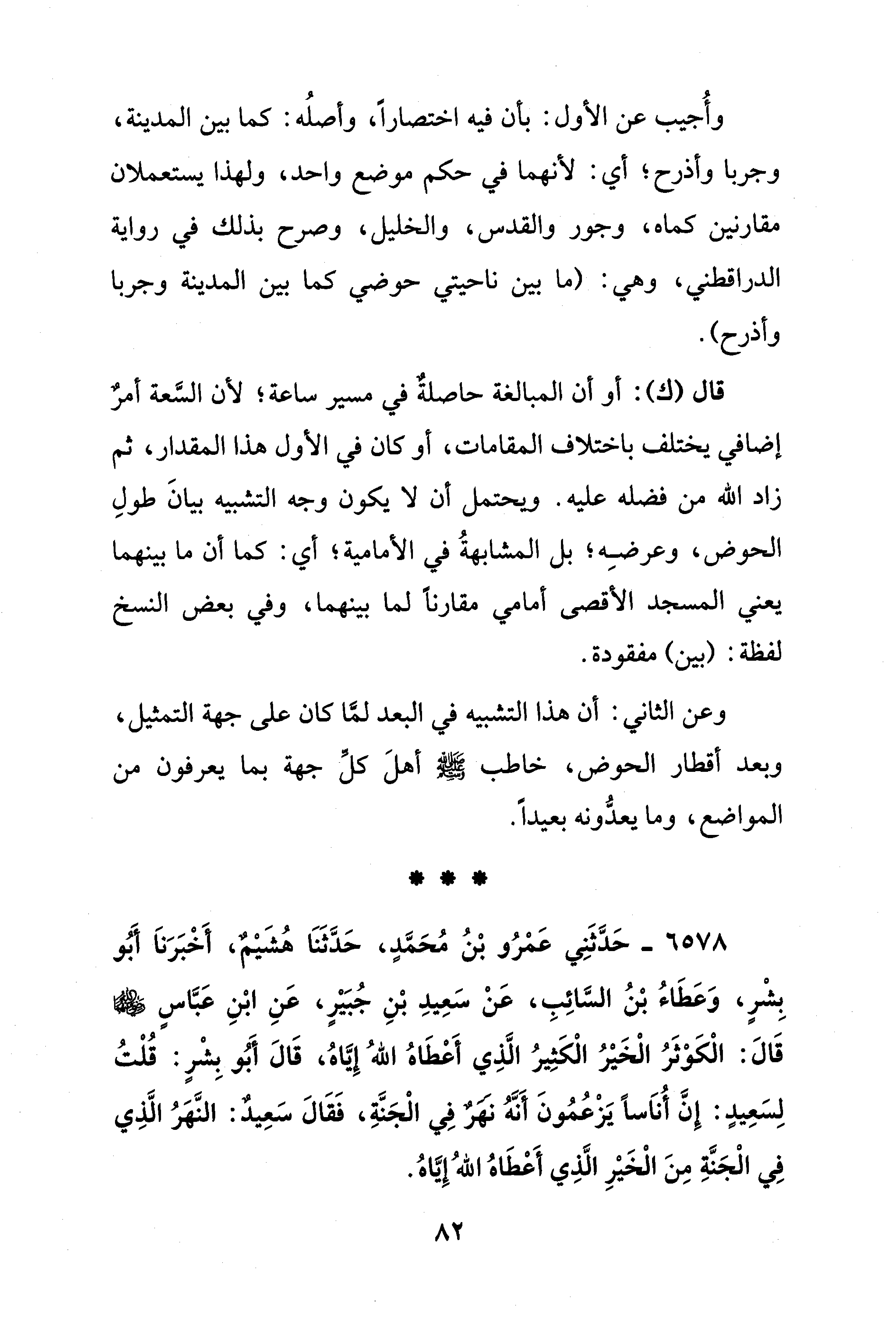 قال (ك): أو أن المبالغة حاصلةٌ في مسير ساعة؛ لأن السَّعة أمرٌ إضافي يختلف باختلاف المقامات، أو كان في الأول هذا المقدار، ثم زاد الله من فضله عليه. ويحتمل أن لا يكون وجه التشبيه بيانَ طولِ الحوض، وعرضِه؛ بل المشابهةُ في الأمامية؛ أي: كما أن ما بينهما يعني المسجد الأقصى أمامي مقارنًا لما بينهما، وفي بعض النسخ لفظة: (بين) مفقودة.