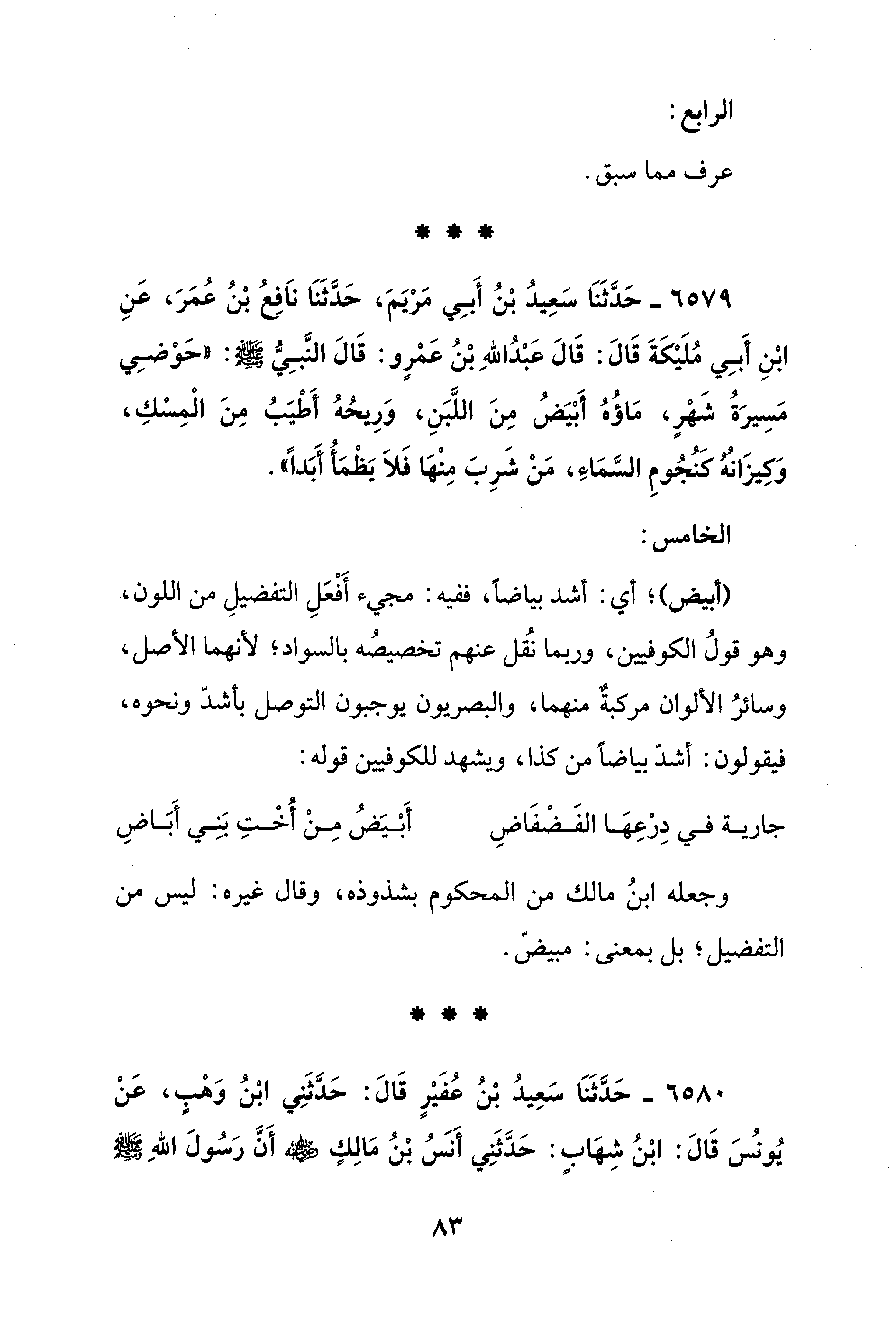 6579 - حَدَّثَنَا سَعِيدُ بْنُ أَبِي مَرْيَمَ، حَدَّثَنَا نَافِعُ بْنُ عُمَرَ، عَنِ ابْنِ أَبِي مُلَيْكَةَ قَالَ: قَالَ عَبْدُ اللهِ بْنُ عَمْرٍو: قَالَ النَّبِيُّ - صلى الله عليه وسلم -: "حَوْضِي مَسِيرَةُ شَهْرٍ، مَاؤُهُ أَبْيَضُ مِنَ اللَّبَنِ، وَرِيحُهُ أَطْيَبُ مِنَ الْمِسْكِ، وَكِيزَانُهُ كنُجُومِ السَّمَاءِ، مَنْ شَرِبَ مِنْهَا فَلَا يَظْمَأُ أَبَدًا".
