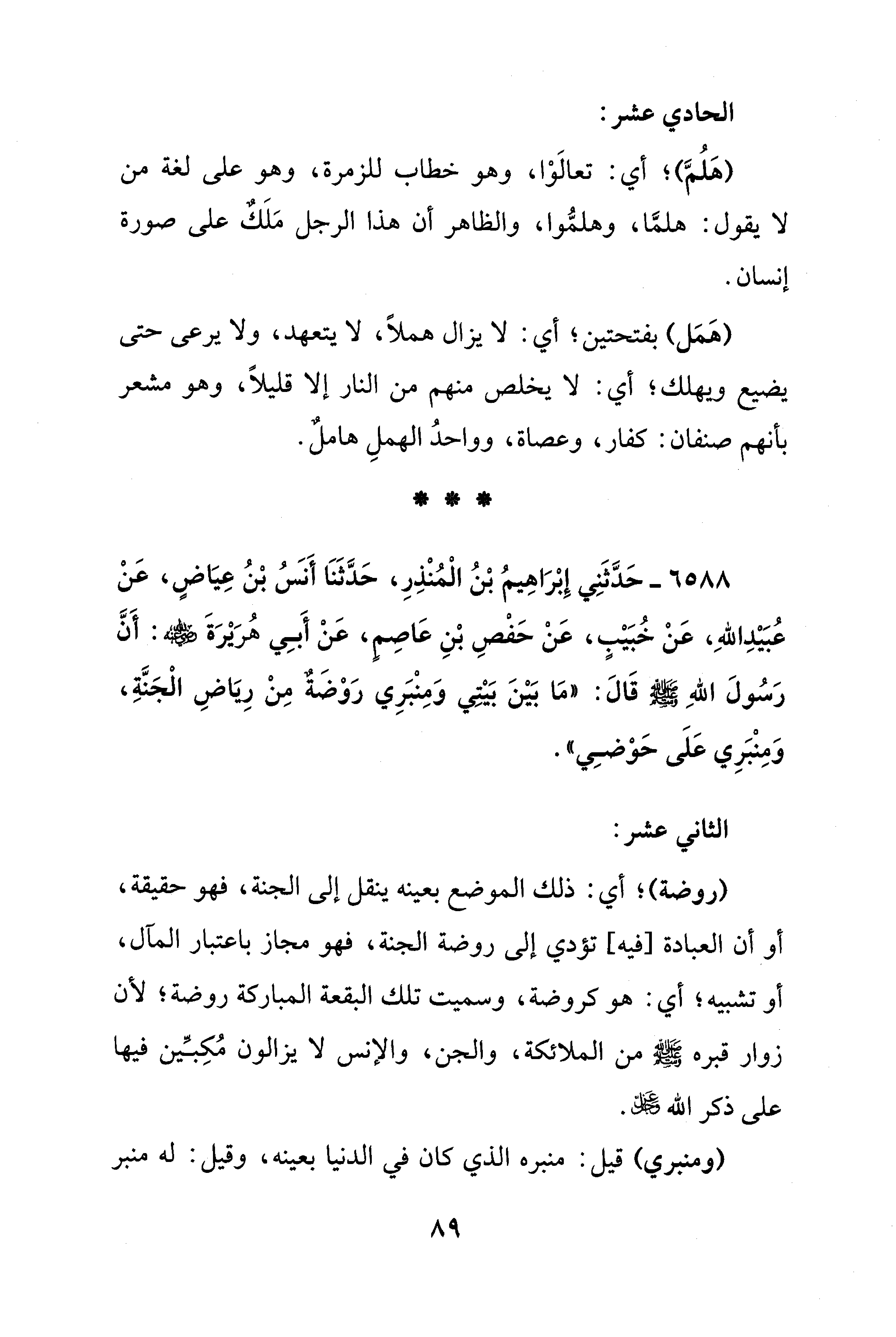 6588 - حَدَّثَنِي إِبْرَاهِيمُ بْنُ الْمُنْذِرِ، حَدَّثَنَا أَنسُ بْنُ عِيَاضٍ، عَنْ عُبَيْدِ اللهِ، عَنْ خُبَيْبٍ، عَنْ حَفْصِ بْنِ عَاصِمٍ، عَنْ أَبِي هُرَيْرَةَ - رضي الله عنه -: أَنَّ رَسُولَ اللهِ - صلى الله عليه وسلم - قَالَ: "مَا بَيْنَ بَيْتِي وَمِنْبَرِي رَوْضَةٌ مِنْ رِيَاضِ الْجَنَّةِ، وَمِنْبَرِي عَلَى حَوْضِي".