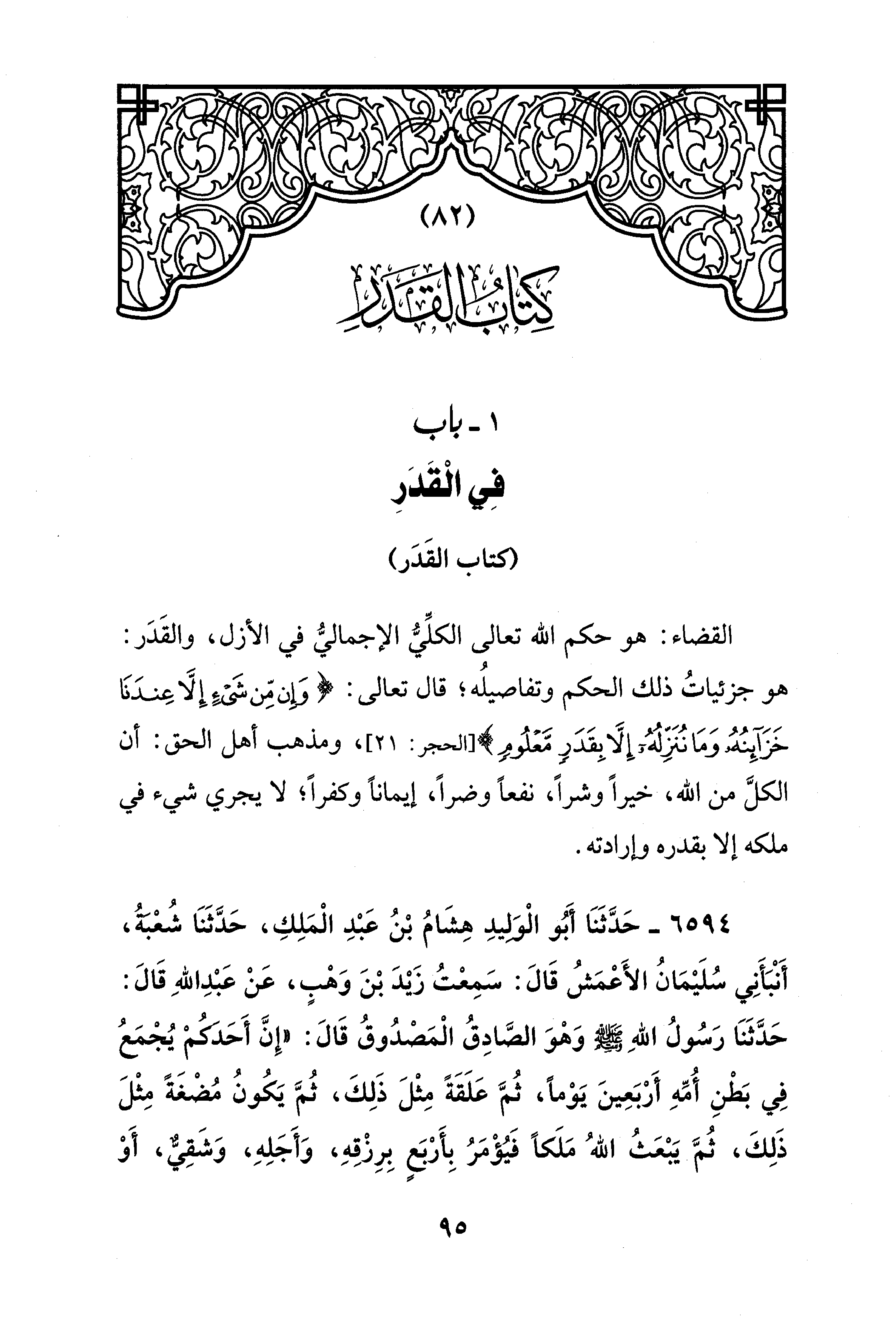القضاء: هو حكم الله تعالى الكلِّيُّ الإجماليُّ في الأزل، والقَدَر: هو جزئياتُ ذلك الحكم وتفاصيلُه؛ قال تعالى: {وَإِنْ مِنْ شَيْءٍ إلا عِنْدَنَا خَزَائِنُهُ وَمَا نُنَزِّلُهُ إلا بِقَدَرٍ مَعْلُومٍ} [الحجر: 21]، ومذهب أهل الحق: أن الكلَّ من الله، خيرًا وشرًّا، نفعًا وضرًّا، إيمانًا وكفرًا؛ لا يجري شيء في ملكه إلا بقدره وإرادته.