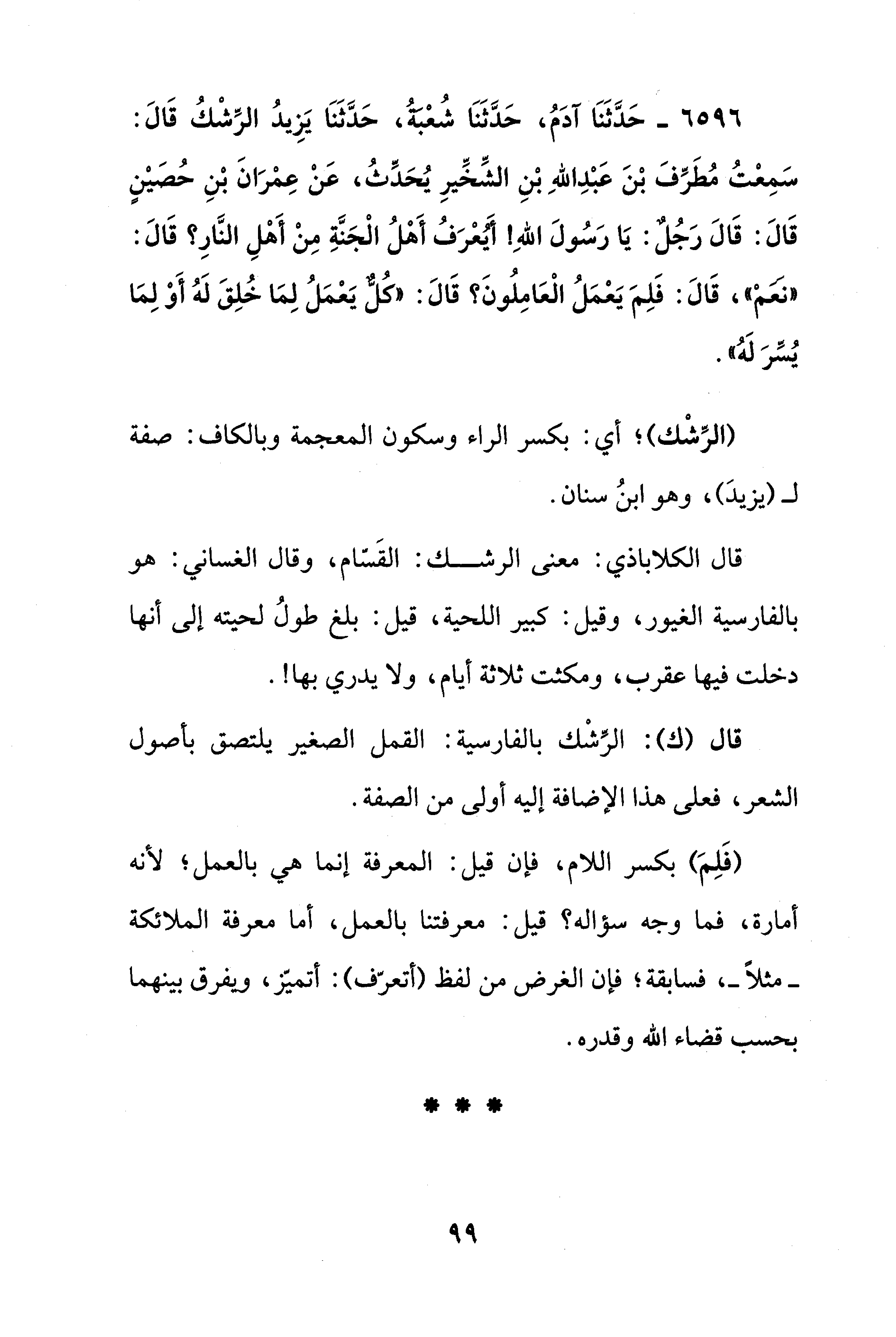 6596 - حَدَّثَنَا آدَمُ، حَدَّثَنَا شُعبةُ، حَدَّثَنَا يَزِيدُ الرِّشْكُ قَالَ: سَمعتُ مُطَرِّفَ بْنَ عَبْدِ اللهِ بْنِ الشِّخِّيرِ يُحَدِّثُ، عَن عمرَانَ بْنِ حُصَين قَالَ: قَالَ رجل: يَا رَسُولَ اللهِ! أيَعرَفُ أَهْلُ الْجَنَّةِ مِنْ أَهْلِ النَّار؟ قَالَ: "نعم"، قَالَ: فَلِمَ يعمَلُ الْعَامِلُون؟ قَالَ: "كُل يَعمَلُ لِمَا خُلِقَ لَهُ أَوْ لِمَا يُسِّرَ لَه".