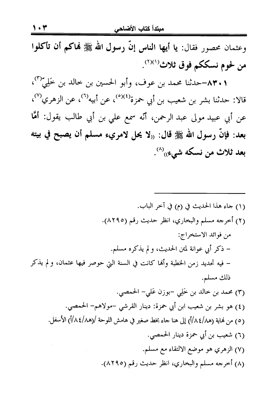 8301 - حدثنا محمد بن عوف، وأبو الحسين بن خالد بن خَلِيّ (¬1)، قالا: حدثنا بشر بن شعيب بن أبي حمزة (¬2) (¬3)، عن أبيه (¬4)، عن الزهري (¬5)، عن أبي عبيد مولى عبد الرحمن، أنّه سمع علي بن أبي طالب يقول: أمَّا بعد: فإنّ رسول الله -صلى الله عليه وسلم- قال: "لا يحل لامريء مسلم أن يصبح في بيته بعد ثلاث من نسكه شيء" (¬6).