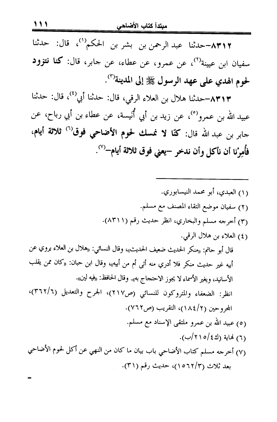 8313 - حدثنا هلال بن العلاء الرقي، قال: حدثنا أبي (¬1)، قال: حدثنا عبيد الله بن عمرو (¬2)، عن زيد بن أبي أنيسة، عن عطاء بن أبي رباح، عن جابر بن عبد الله قال: كنّا لا نمسك لحوم الأضاحي فوق (¬3) ثلاثة أيام، فأُمِرْنا أن نأكل وأن ندخر -يعني فوق ثلاثة أيام- (¬4).