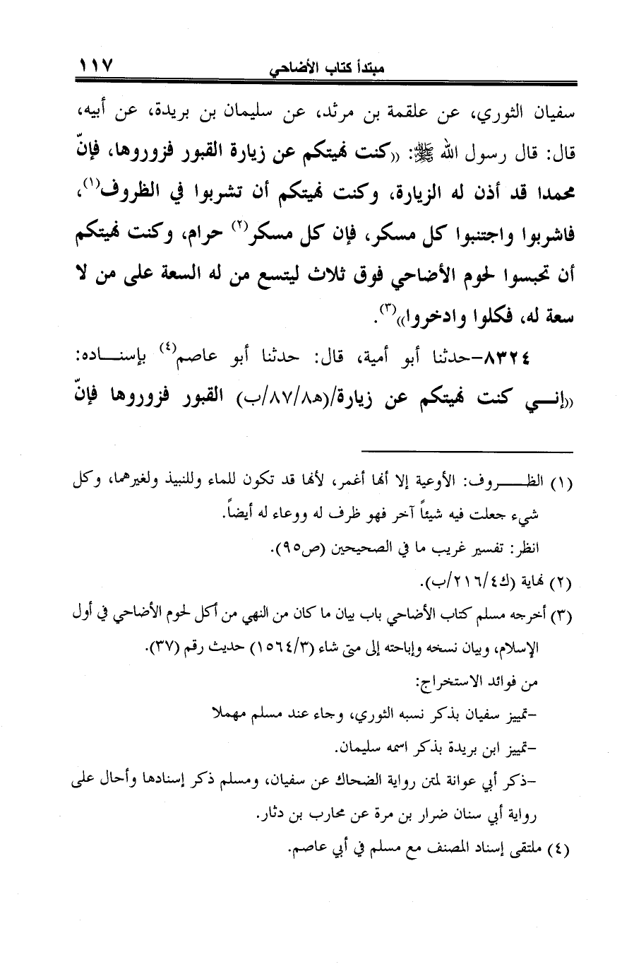 -[118]- محمدا قد أذن له في زيارة قبر أمه، ونهيتكم عن لحوم الأضاحي فوق ثلاث، فكلوا وادخروا" (¬2).
