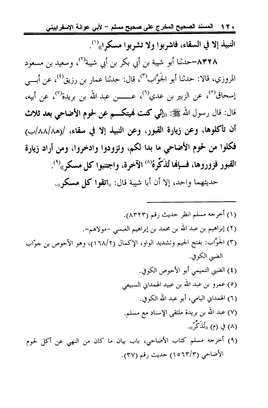 8328 - حدثنا أبو شيبة بن أبي بكر بن أبي شيبة (¬1)، وسعيد بن مسعود المروزي، قالا: حدثنا أبو الجَوَّاب (¬2)، قال: حدثنا عمار بن رزيق (¬3)، عن أبي إسحاق (¬4)، عن الزبير بن عدي (¬5)، عن عبد الله بن بريدة (¬6)، عن أبيه، قال: قال رسول الله -صلى الله عليه وسلم-: "إنّي كنت نهيتكم عن لحوم الأضاحي بعد ثلاث أن تأكلوها، وعن زيارة القبور، وعن النبيذ إلا في سقاء، فكلوا من لحوم الأضاحي ما بدا لكم، وتزودوا وادخروا، ومن أراد زيارة القبور فزوروها، فإنها تُذَكِّرهُ (¬7) الآخرة، واجتنبوا كل مسكر" (¬8).