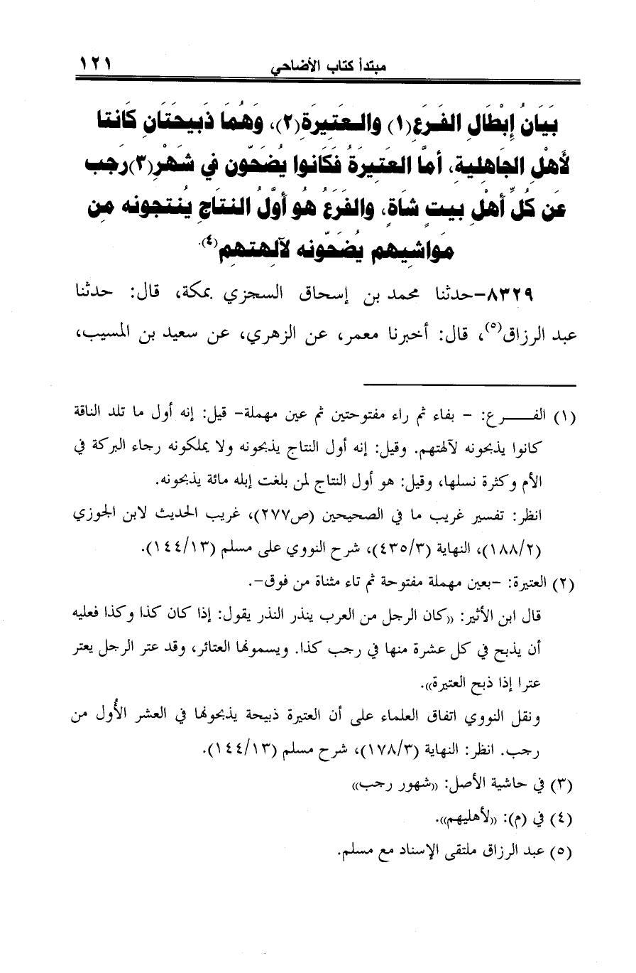 بَيَانُ إِبْطَالِ الفَرَعِ (¬1) والعَتِيرَةِ (¬2)، وَهُمَا ذَبيحَتَانِ كَانتا لأَهْلِ الجَاهِليةِ، أمَّا العَتِيرَةُ فَكَانوا يُضَحّون في شَهْرِ (¬3) رَجب عَن كُلِّ أَهْلِ بيتٍ شَاةٍ، والفَرَعُ هُو أَوَّلُ النتَاجِ يُنتجونه مِن مَواشيِهم يُضَحّونه لآلِهتهِم (¬4).