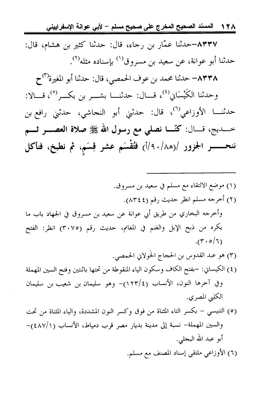 8337 - حدثنا عمّار بن رجاء، قال: حدثنا كثير بن هشام، قال: حدثنا أبو عوانة، عن سعيد بن مسروق (¬1) بإسناده مثله (¬2).