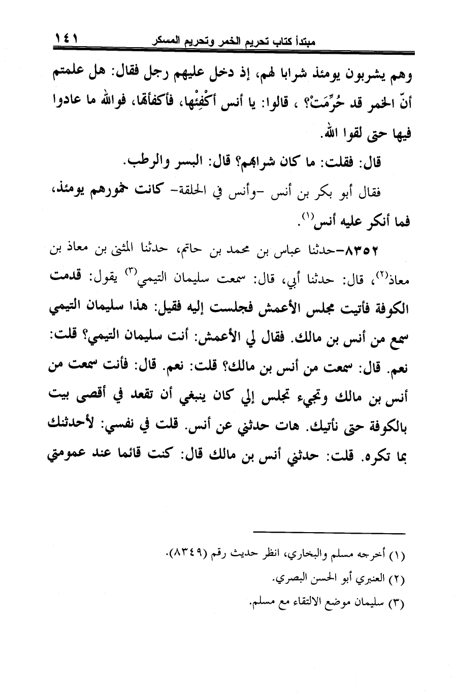 8352 - حدثنا عباس بن محمد بن حاتم، حدثنا المثنى بن معاذ بن معاذ (¬1)، قال: حدثنا أبي، قال: سمعت سليمان التيمي (¬2) يقول: قدمت الكوفة فأتيت مجلس الأعمش فجلست إليه فقيل: هذا سليمان التيمي سمع من أنس بن مالك. فقال لي الأعمش: أنت سليمان التيمي؟ قلت: نعم. قال: سمعت من أنس بن مالك؟ قلت: نعم. قال: فأنت سمعت من أنس بن مالك وتجيء تجلس إلي كان ينبغي أن تقعد في أقصى بيت بالكوفة حتى نأتيك. هات حدثني عن أنس. قلت في نفسي: لأحدثنك بما تكره. قلت: حدثني أنس بن مالك قال: كنت قائما عند عمومتي