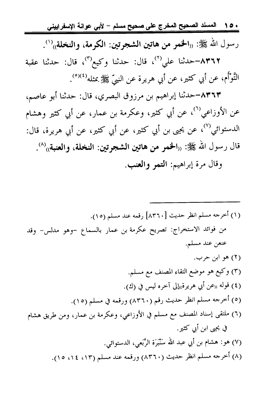 8363 - حدثنا إبراهيم بن مرزوق البصري، قال: حدثنا أبو عاصم، عن الأوزاعي (¬1)، عن أبي كثير، وعكرمة بن عمار، عن أبي كثير وهشام الدستوائي (¬2)، عن يحيى بن أبي كثير، عن أبي كثير، عن أبي هريرة، قال: قال رسول الله -صلى الله عليه وسلم-: "الخمر من هاتين الشجرتين: النخلة، والعنبة" (¬3).