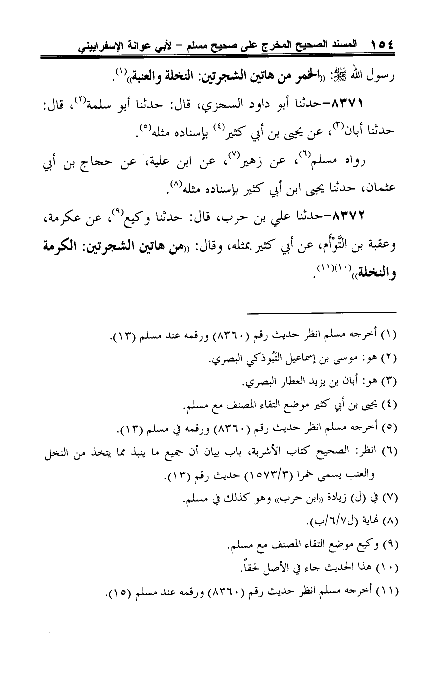 (¬5) انظر: الصحيح كتاب الأشربة، باب بيان أن جميع ما ينبذ مما يتخذ من النخل والعنب يسمى خمرا (3/ 1573) حديث رقم (13).