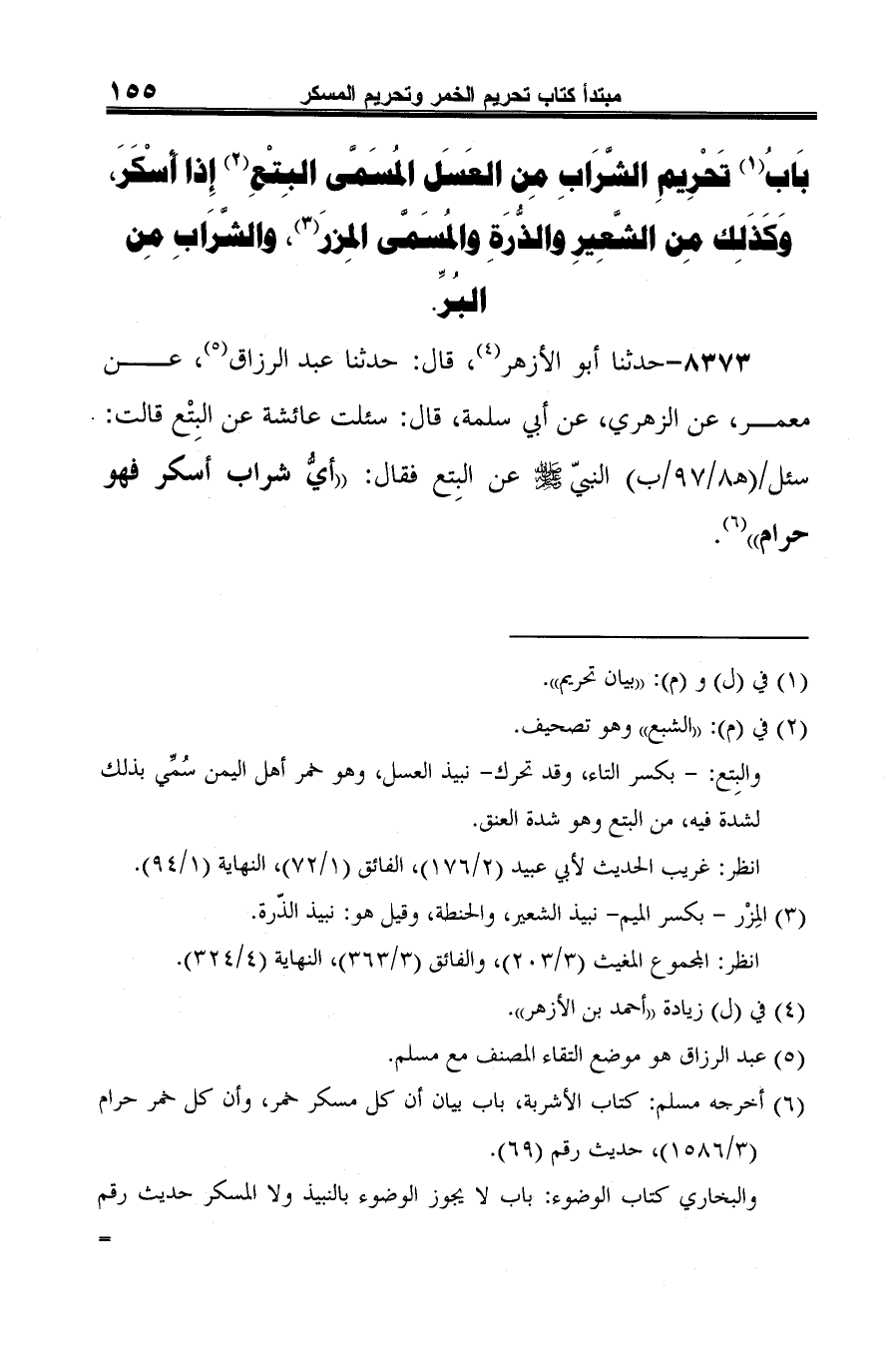 8373 - حدثنا أبو الأزهر (¬1)، قال: حدثنا عبد الرزاق (¬2)، عن معمر، عن الزهري، عن أبي سلمة، قال: سئلت عائشة عن البِتْع قالت: سئل النبيّ -صلى الله عليه وسلم- عن البِتع فقال: "أيُّ شراب أسكر فهو حرام" (¬3).