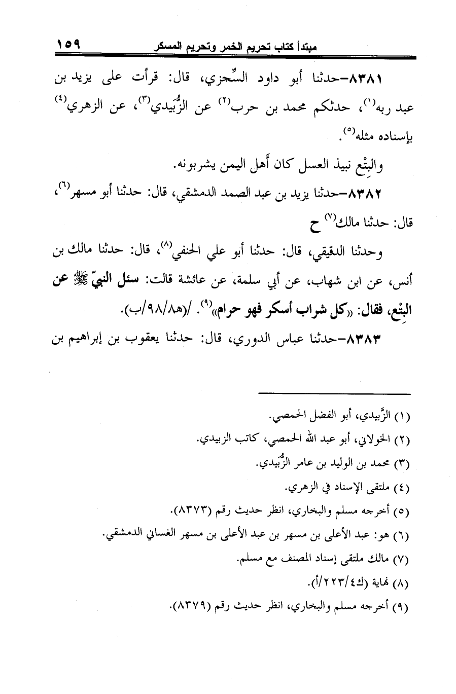 8381 - حدثنا أبو داود السِّجزي، قال: قرأت على يزيد بن عبد ربه (¬1)، حدثكم محمد بن حرب (¬2) عن الزُّبَيدي (¬3)، عن الزهري (¬4) بإسناده مثله (¬5).
