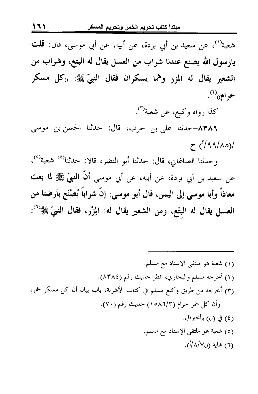 وحدثنا الصاغاني، قال: حدثنا أبو النضر، قالا: حدثنا (¬1) شعبة (¬2)، عن سعيد بن أبي بردة، عن أبيه، عن أبي موسى أنّ النبيّ -صلى الله عليه وسلم- لما بعث معاذًا وأبا موسى إلى اليمن، قال أبو موسى: إنّ شرابًا يُصْنَع بأرضنا من العسل يقال له البِتْع، ومن الشعر يقال له: المِزْر، فقال النبيّ -صلى الله عليه وسلم- (¬3):