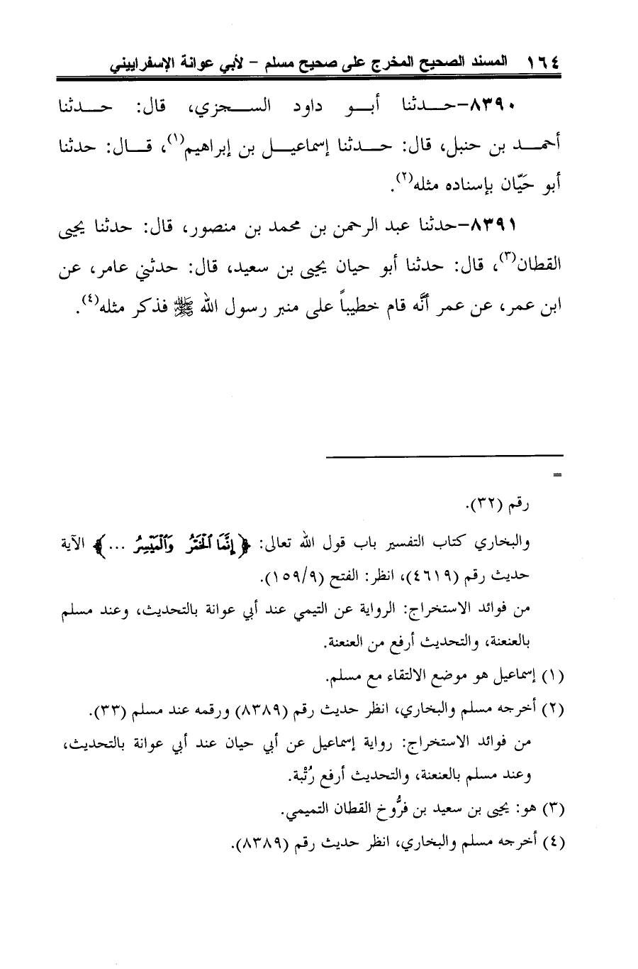 من فوائد الاستخراج: رواية إسماعيل عن أبي حيان عند أبي عوانة بالتحديث، وعند مسلم بالعنعنة، والتحديث أرفع رُتْبة.