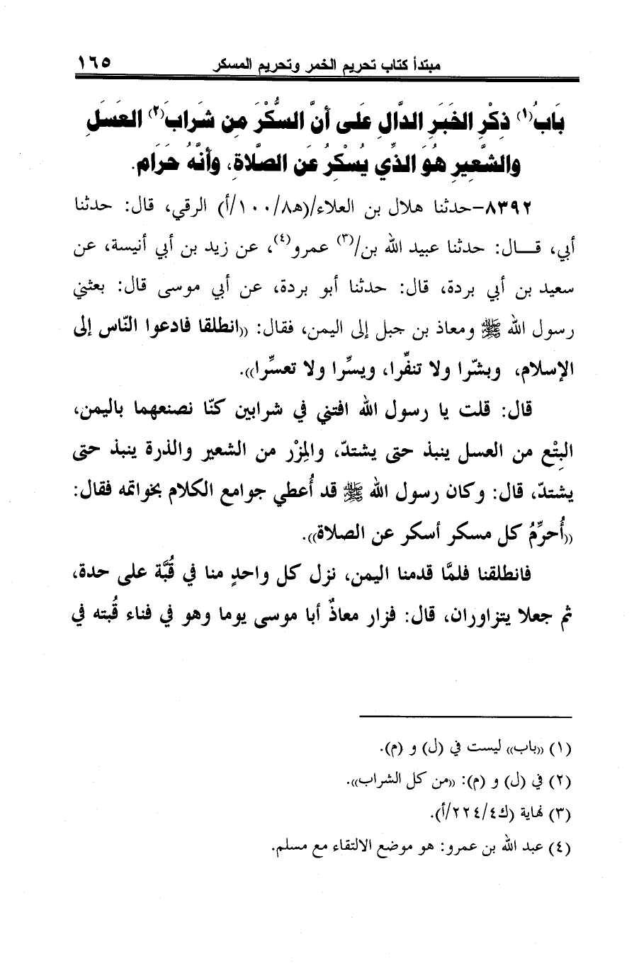 قال: قلت يا رسول الله افتني في شرابين كنّا نصنعهما باليمن، البِتْع من العسل ينبذ حتى يشتدّ، والمِزْر من الشعير والذرة ينبذ حتى يشتدّ، قال: وكان رسول الله -صلى الله عليه وسلم- قد أُعطي جوامع الكلام بخواتمه فقال: "أُحرِّمُ كل مسكر أسكر عن الصلاة".
