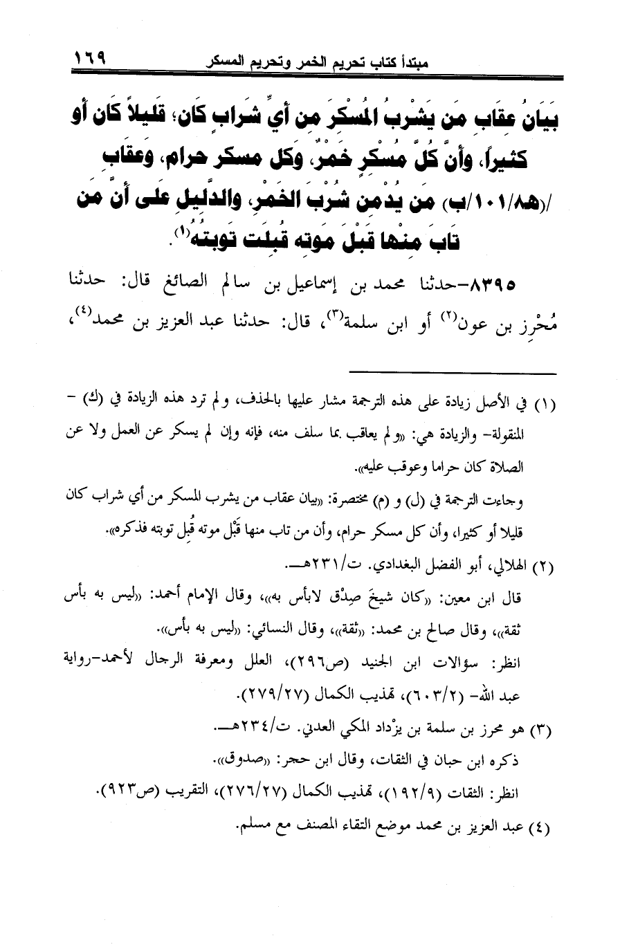 (¬1) في الأصل زيادة على هذه الترجمة مشار عليها بالحذف، ولم ترد هذه الزيادة في (ك) -المنقولة- والزيادة هي: "ولم يعاقب بما سلف منه، فإنه وإن لم يسكر عن العمل ولا عن الصلاة كان حراما وعوقب عليه".