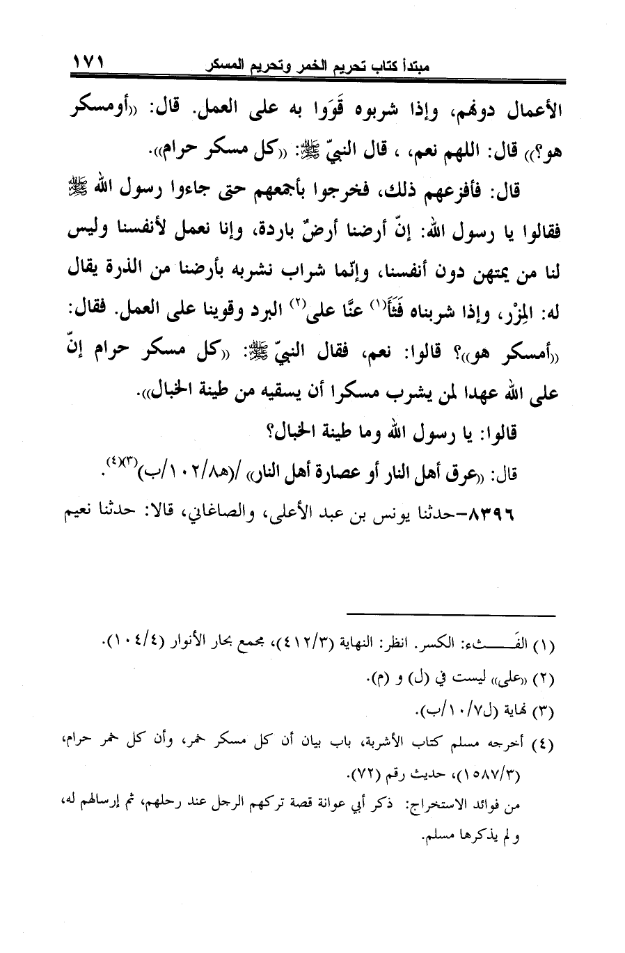 -[172]- ابن حماد (¬1)، قال: حدثنا عبد العزيز بن محمد (¬2)، عن عُمَارة بن غَزِيَّة، عن أبي الزبير، عن جابر، عن النبيّ -صلى الله عليه وسلم- قال: "كل مسكر حرام، إنّ على الله عهدًا (¬3) لمن يشرب مسكرا أن يسقيه من طينة الخبال". قالوا يا رسول الله: وما طينة الخبال؟ قال: "عرق أهل النار أو عصارة أهل النار" (¬4).
