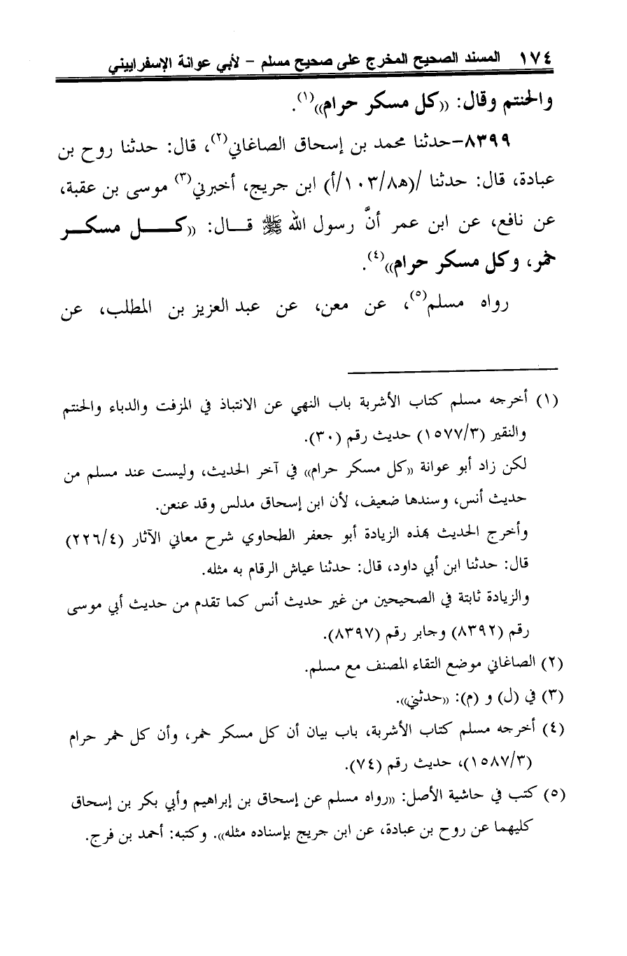 8399 - حدثنا محمد بن إسحاق الصاغاني (¬1)، قال: حدثنا روح بن عبادة، قال: حدثنا ابن جريج، أخبرني (¬2) موسى بن عقبة، عن نافع، عن ابن عمر أنَّ رسول الله -صلى الله عليه وسلم- قال: "كل مسكر خمر، وكل مسكر حرام" (¬3).