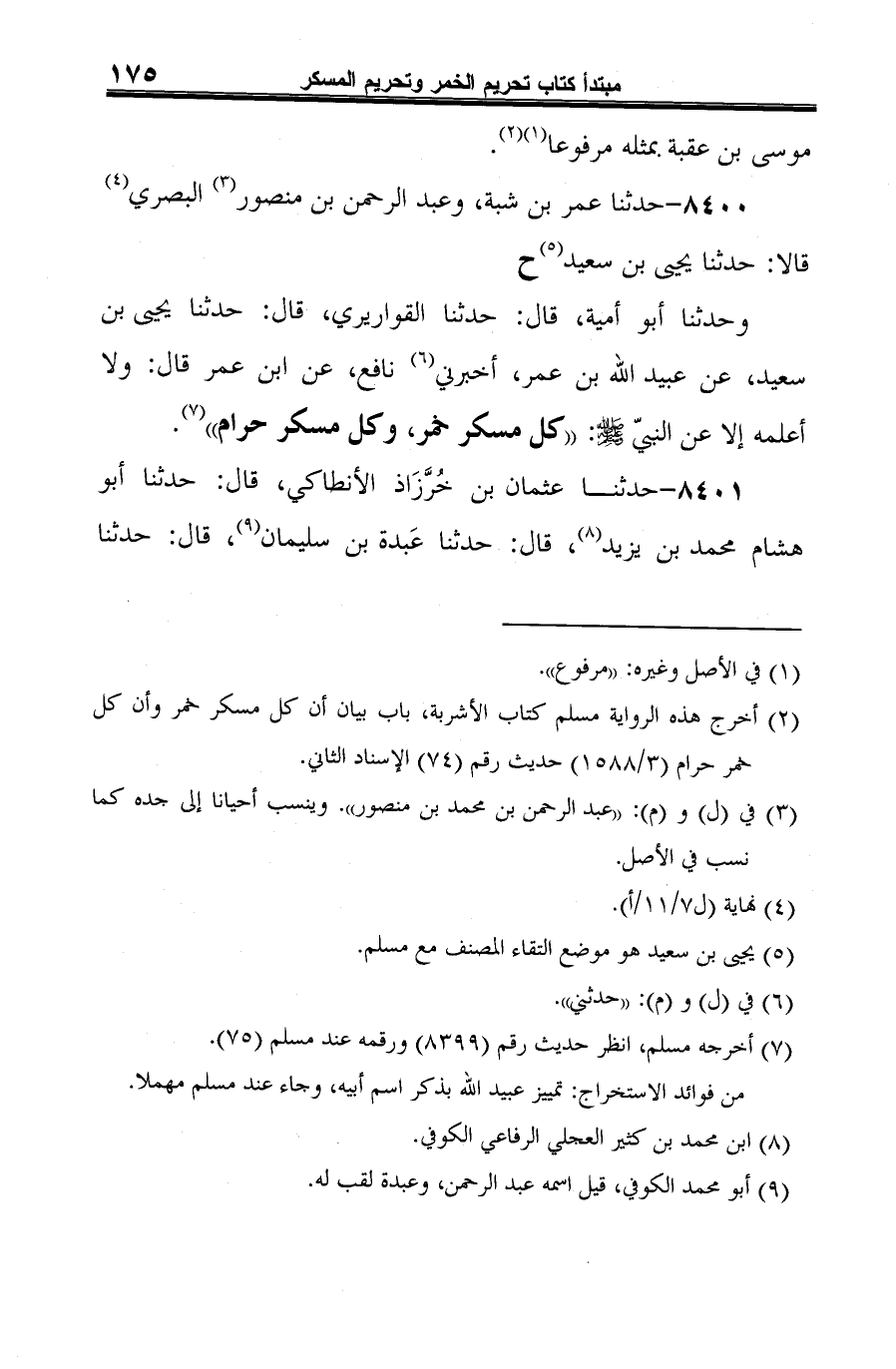 -[176]- عبيد الله بن عمر (¬3)، عن نافع، عن ابن عمر قال: قال رسول الله -صلى الله عليه وسلم-: "كل مسكر خمر، وكل مسكر حرام" (¬4).