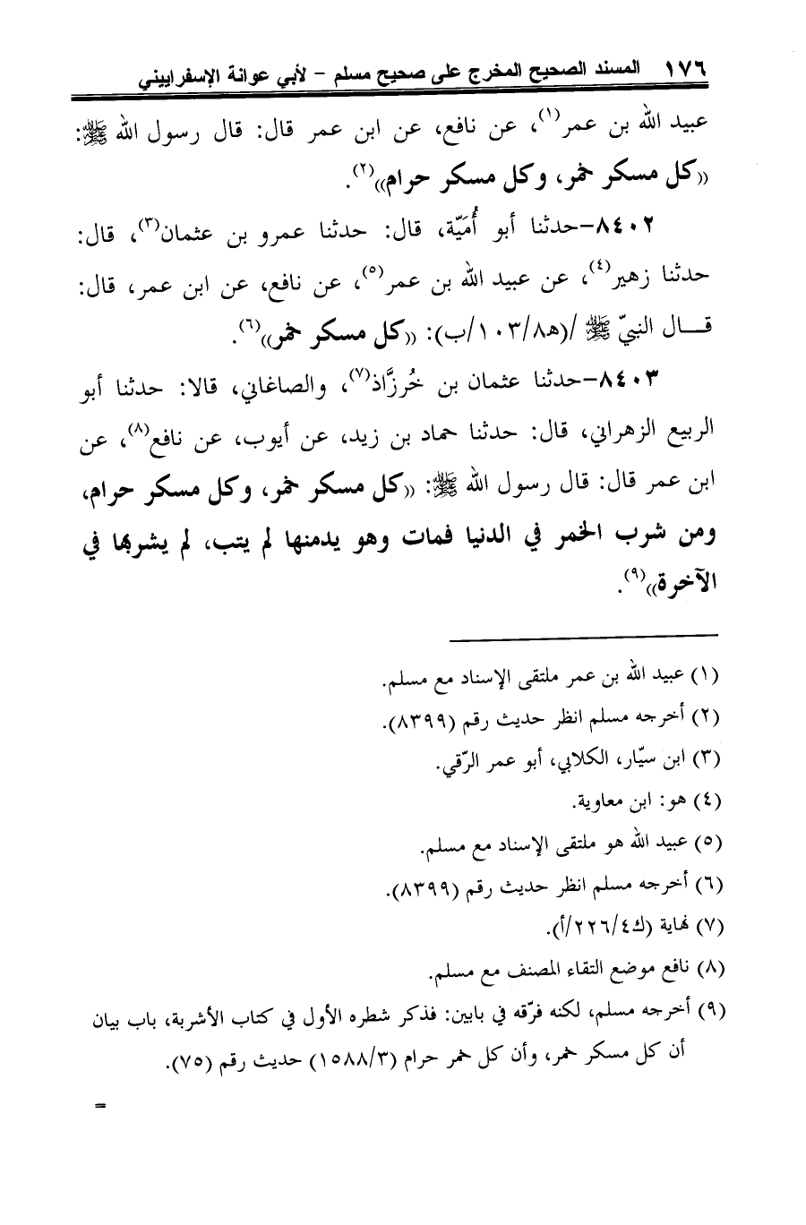 8402 - حدثنا أبو أُمَيّة، قال: حدثنا عمرو بن عثمان (¬1)، قال: حدثنا زهير (¬2)، عن عبيد الله بن عمر (¬3)، عن نافع، عن ابن عمر، قال: قال النبيّ -صلى الله عليه وسلم-: "كل مسكر خمر" (¬4).