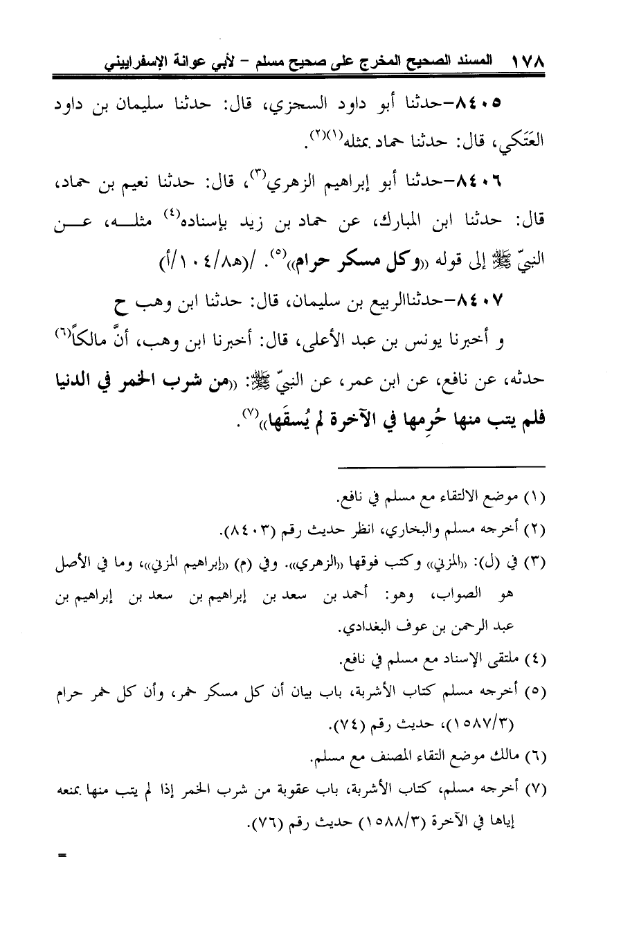 8406 - حدثنا أبو إبراهيم الزهري (¬1)، قال: حدثنا نعيم بن حماد، قال: حدثنا ابن المبارك، عن حماد بن زيد بإسناده (¬2) مثله، عن النبيّ -صلى الله عليه وسلم- إلى قوله "وكل مسكر حرام" (¬3).