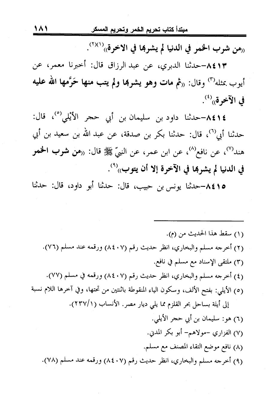 8413 - حدثنا الدبري، عن عبد الرزاق قال: أخبرنا معمر، عن أيوب بمثله (¬1) وقال: "ثم مات وهو يشربها ولم يتب منها حَرَّمها الله عليه في الآخرة" (¬2).