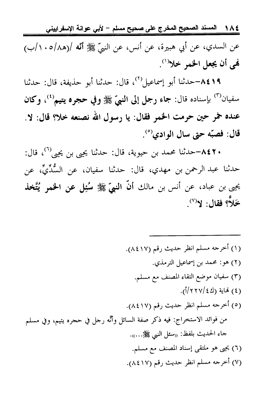 8420 - حدثنا محمد بن حيوية، قال: حدثنا يحيى بن يحيى (¬1)، قال: حدثنا عبد الرحمن بن مهدي، قال: حدثنا سفيان، عن السُّدِّيِّ، عن يحيى بن عباد، عن أنس بن مالك أنّ النبيّ -صلى الله عليه وسلم- سُئِل عن الخمر يُتَّخذ خَلًّا؟ فقال: لا (¬2).