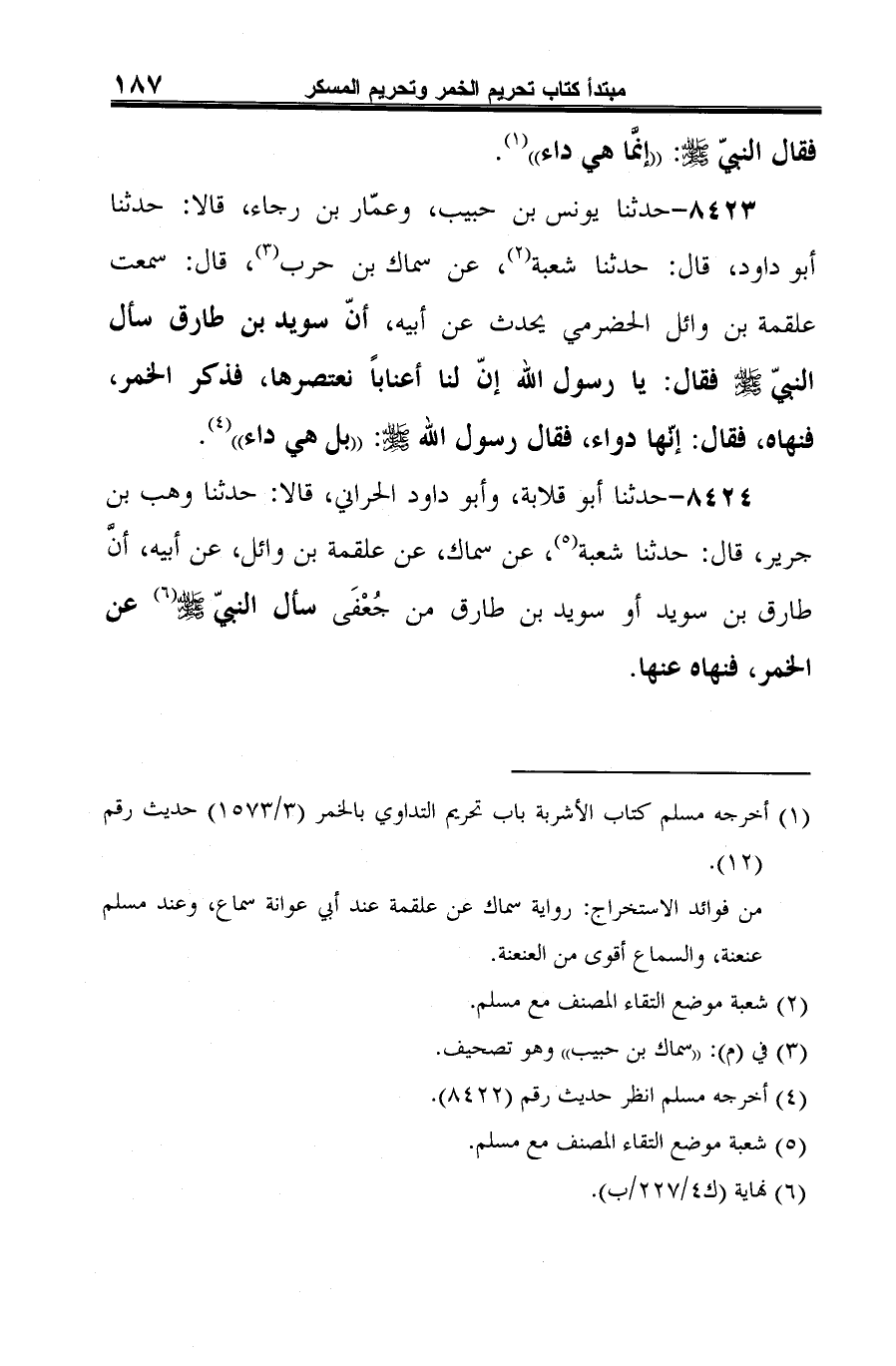 8424 - حدثنا أبو قلابة، وأبو داود الحراني، قالا: حدثنا وهب بن جرير، قال: حدثنا شعبة (¬1)، عن سماك، عن علقمة بن وائل، عن أبيه، أنَّ طارق بن سويد أو سويد بن طارق من جُعْفَى سأل النبيّ -صلى الله عليه وسلم- (¬2) عن الخمر، فنهاه عنها.