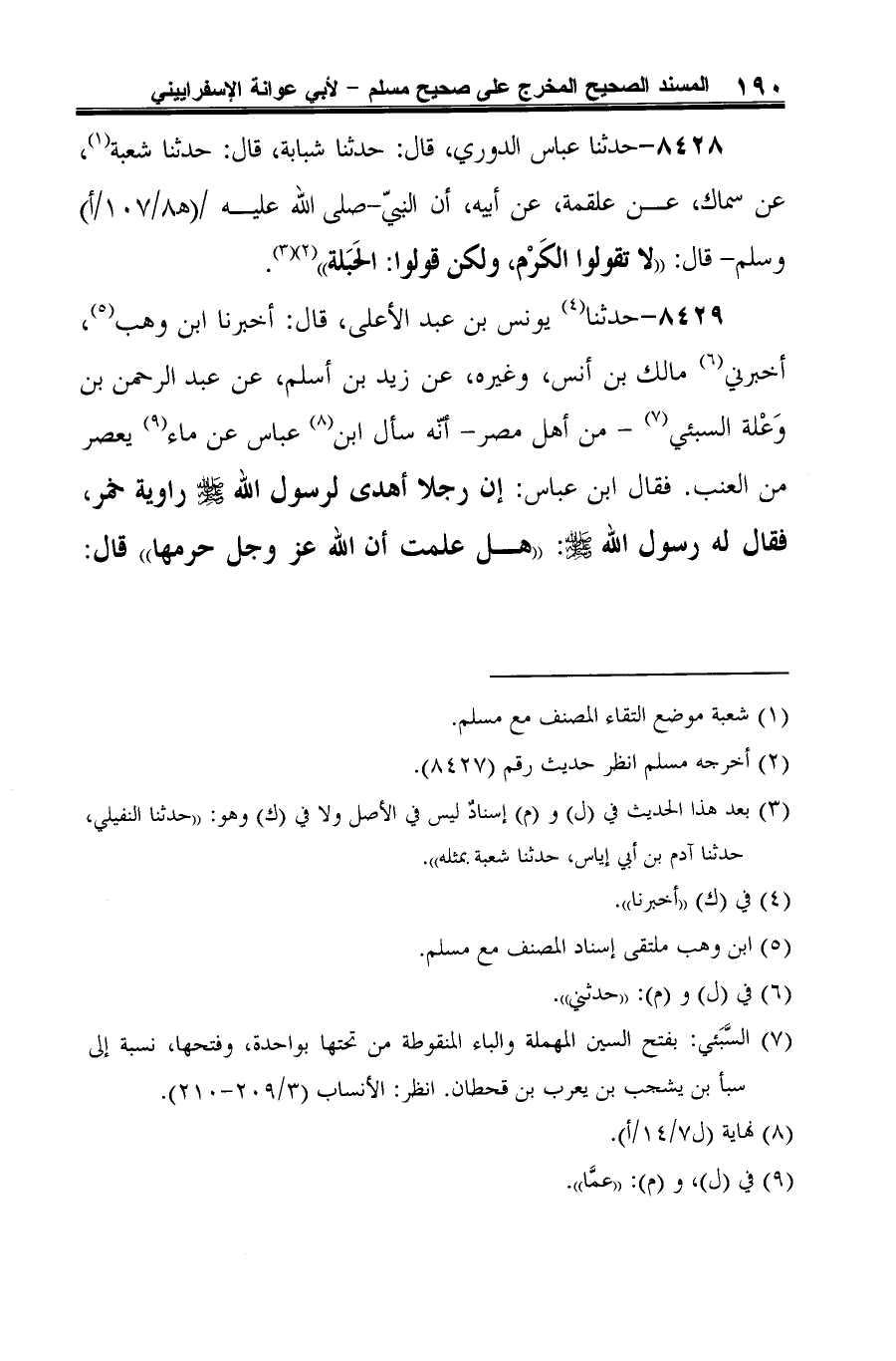 8429 - حدثنا (¬1) يونس بن عبد الأعلى، قال: أخبرنا ابن وهب (¬2)، أخبرني (¬3) مالك بن أنس، وغيره، عن زيد بن أسلم، عن عبد الرحمن بن وَعْلة السبئي (¬4) -من أهل مصر- أنّه سأل ابن (¬5) عباس عن ماء (¬6) يعصر من العنب. فقال ابن عباس: إن رجلا أهدى رسول الله -صلى الله عليه وسلم- راوية خمر، فقال له رسول الله -صلى الله عليه وسلم-: "هل علمت أن الله عز وجل حرمها" قال: