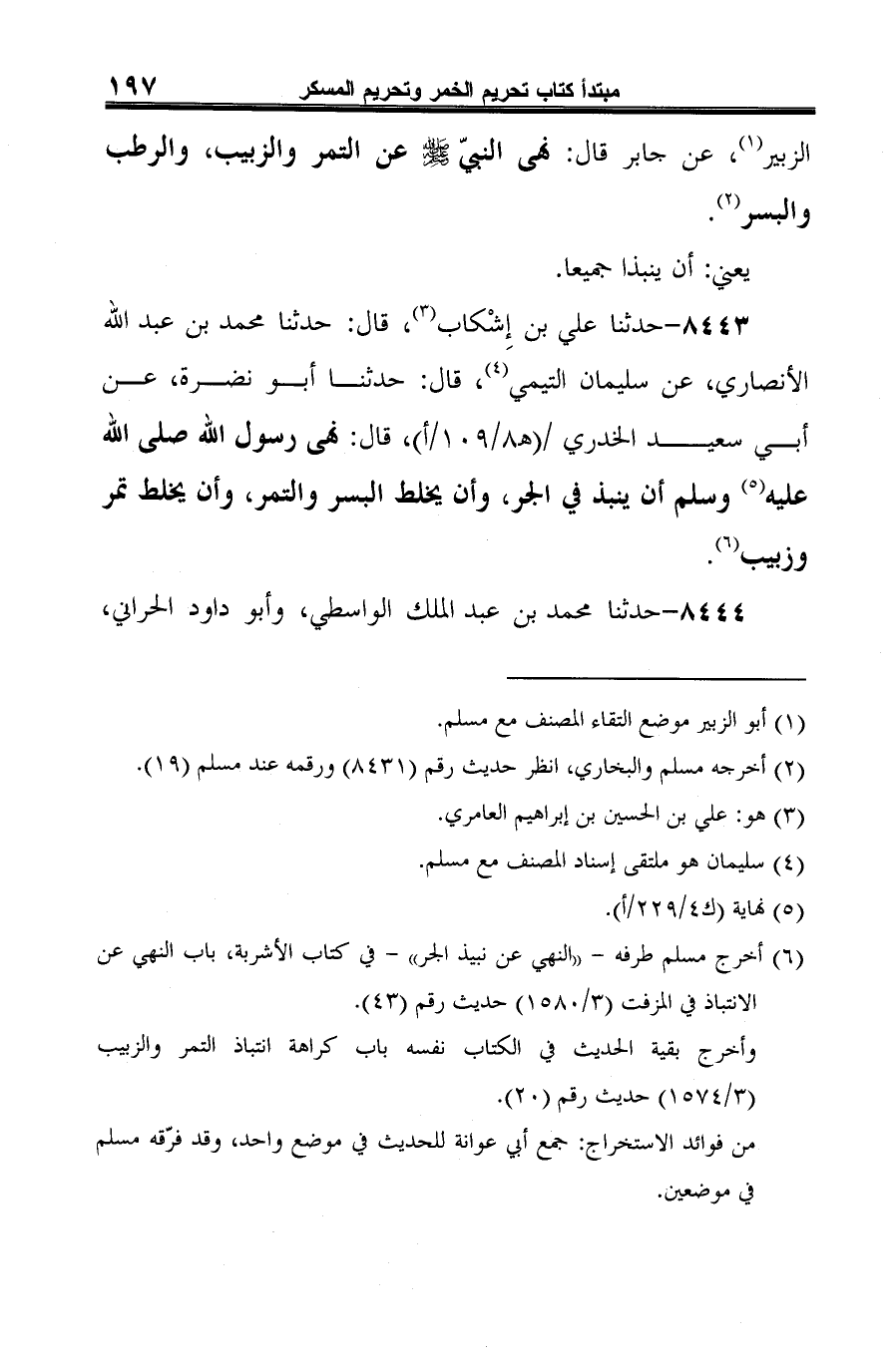 8443 - حدثنا علي بن إِشْكاب (¬1)، قال: حدثنا محمد بن عبد الله الأنصاري، عن سليمان التيمي (¬2)، قال: حدثنا أبو نضرة، عن أبي سعيد الخدري، قال: نهى رسول الله صلى الله عليه (¬3) وسلم أن ينبذ في الجر، وأن يخلط البسر والتمر، وأن يخلط تمر وزبيب (¬4).