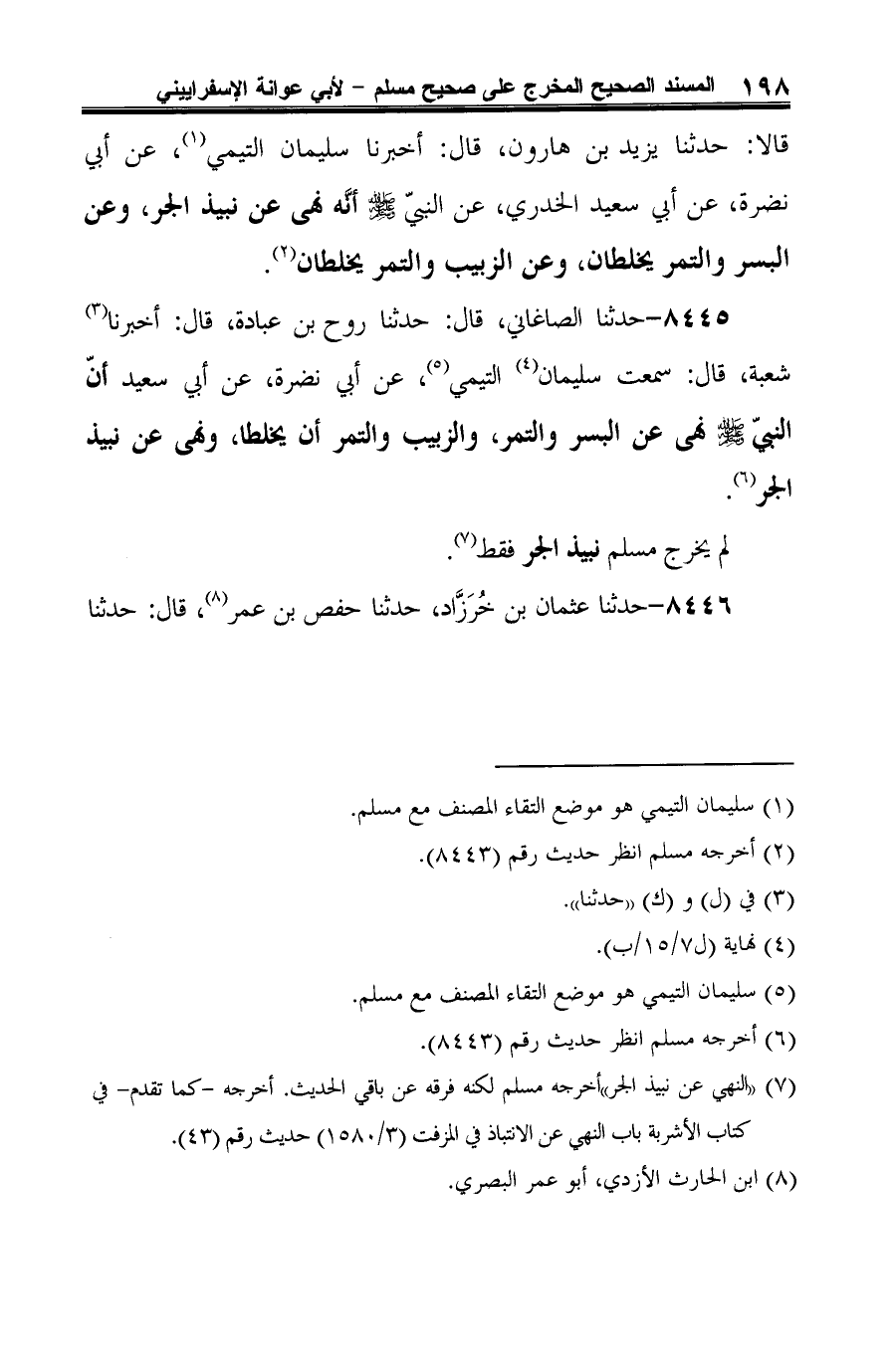8445 - حدثنا الصاغاني، قال: حدثنا روح بن عبادة، قال: أخبرنا (¬1) شعبة، قال: سمعت سليمان (¬2) التيمي (¬3)، عن أبي نضرة، عن أبي سعيد أنّ النبيّ -صلى الله عليه وسلم- نهى عن البسر والتمر، والزبيب والتمر أن يخلطا، ونهى عن نبيذ الجر (¬4).