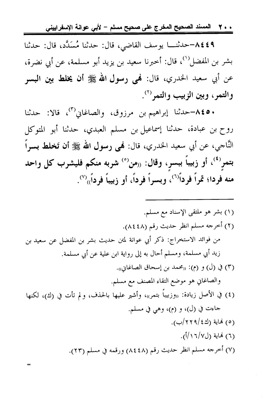 8449 - حدثنا يوسف القاضي، قال: حدثنا مُسَدَّد، قال: حدثنا بشر بن المفضل (¬1)، قال: أخبرنا سعيد بن يزيد أبو مسلمة، عن أبي نضرة، عن أبي سعيد الخدري، قال: نهى رسول الله -صلى الله عليه وسلم- أن يخلط بين البسر والتمر، وبين الزبيب والتمر (¬2).
