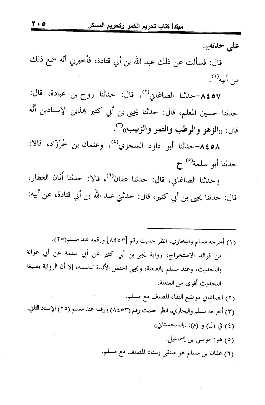 8457 - حدثنا الصاغاني (¬1)، قال: حدثنا روح بن عبادة، قال: حدثنا حسين المعلم، قال: حدثنا يحيى بن أبي كثير بهذين الإسنادين أنَّه قال: "الزهو والرطب والتمر والزبيب" (¬2).