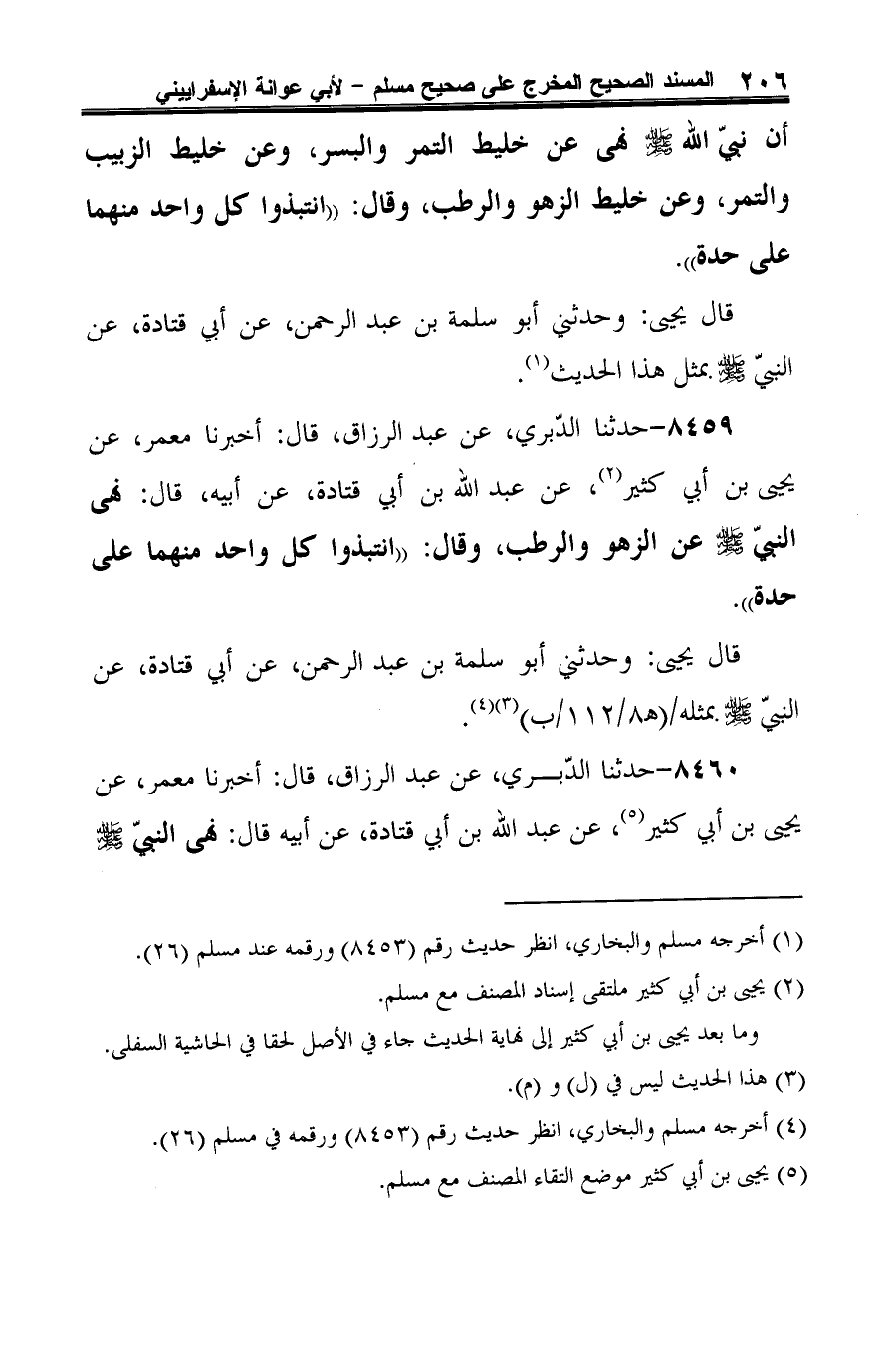 8459 - حدثنا الدّبري، عن عبد الرزاق، قال: أخبرنا معمر، عن يحيى بن أبي كثير (¬1)، عن عبد الله بن أبي قتادة، عن أبيه، قال: نهى النبيّ -صلى الله عليه وسلم- عن الزهو والرطب، وقال: "انتبذوا كل واحد منهما على حدة".