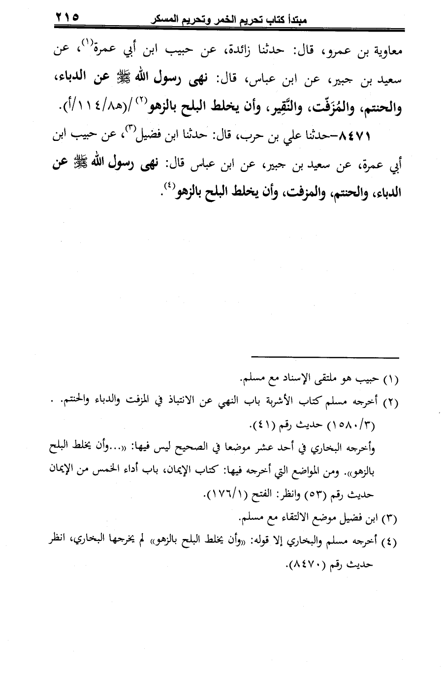 8471 - حدثنا علي بن حرب، قال: حدثنا ابن فضيل (¬1)، عن حبيب ابن أبي عمرة، عن سعيد بن جبير، عن ابن عباس قال: نهى رسول الله -صلى الله عليه وسلم- عن الدباء، والحنتم، والمزفت، وأن يخلط البلح بالزهو (¬2).