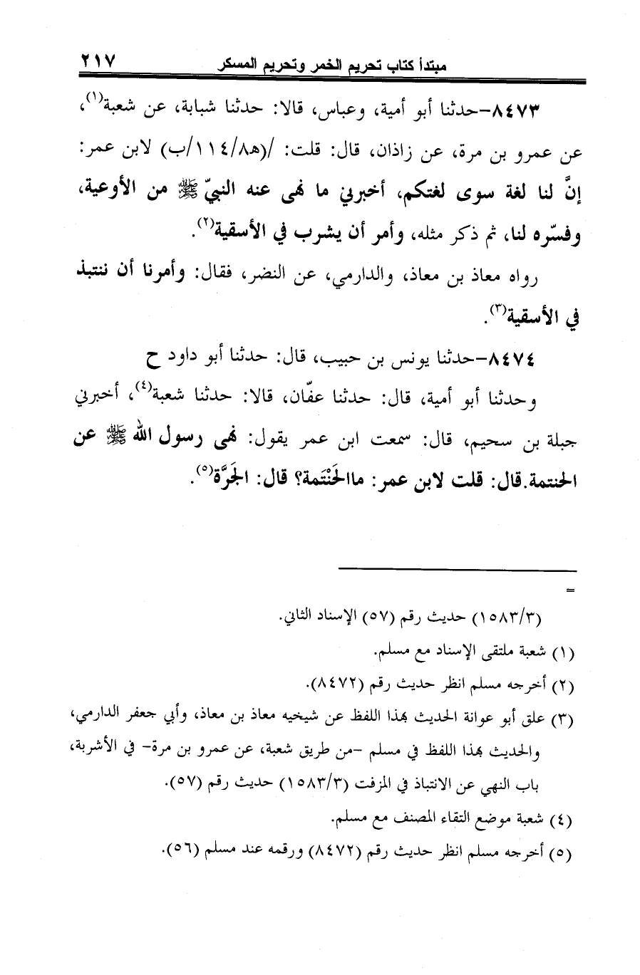 (¬3) علق أبو عوانة الحديث بهذا اللفظ عن شيخيه معاذ بن معاذ، وأبي جعفر الدارمي، والحديث بهذا اللفظ في مسلم -من طريق شعبة، عن عمرو بن مرة- في الأشربة، باب النهي عن الانتباذ في الزفت (3/ 1583) حديث رقم (57).