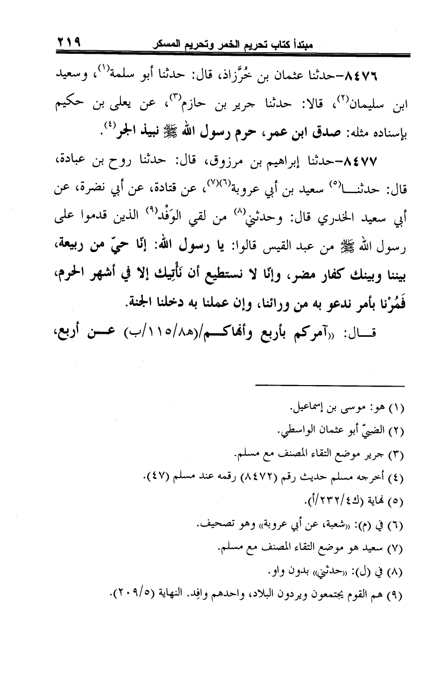 8477 - حدثنا إبراهيم بن مرزوق، قال: حدثنا روح بن عبادة، قال: حدثنا (¬1) سعيد بن أبي عروبة (¬2) (¬3)، عن قتادة، عن أبي نضرة، عن أبي سعيد الخدري قال: وحدثني (¬4) من لقي الوَفْد (¬5) الذين قدموا على رسول الله -صلى الله عليه وسلم- من عبد القيس قالوا: يا رسول الله: إنَّا حيّ من ربيعة، بيننا وبينك كفار مضر، وإنَّا لا نستطيع أن نَأْتِيك إلا في أشهر الحرم، فَمُرْنا بأمر ندعو به من ورائنا، وإن عملنا به دخلنا الجنة.