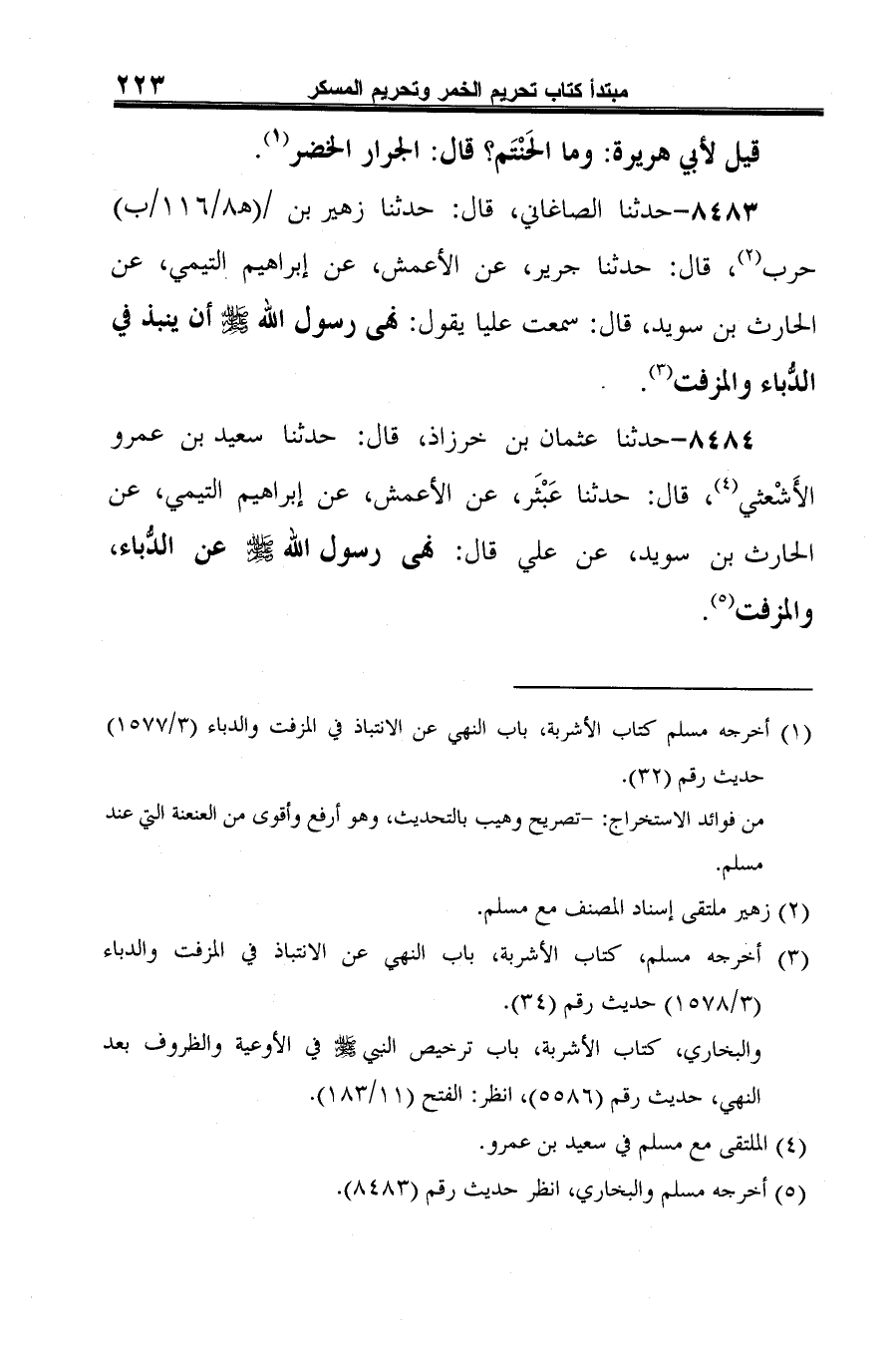 8483 - حدثنا الصاغاني، قال: حدثنا زهير بن حرب (¬1)، قال: حدثنا جرير، عن الأعمش، عن إبراهيم التيمي، عن الحارث بن سويد، قال: سمعت عليًّا يقول: نهى رسول الله -صلى الله عليه وسلم- أن ينبذ في الدُّباء والزفت (¬2).