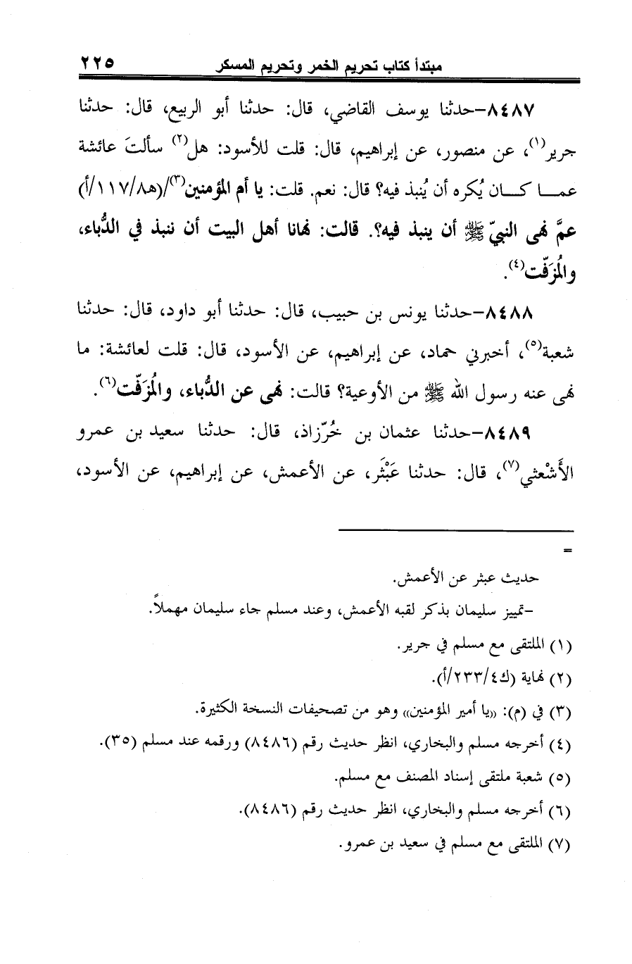 8487 - حدثنا يوسف القاضي، قال: حدثنا أبو الرَّبيع، قال: حدثنا جرير (¬1)، عن منصور، عن إبراهيم، قال: قلت للأسود: هل (¬2) سألتَ عائشة عما كان يُكره أن يُنبذ فيه؟ قال: نعم. قلت: يا أم المؤمنين (¬3) عمَّ نهى النبيّ -صلى الله عليه وسلم- أن ينبذ فيه؟. قالت: نهانا أهل البيت أن ننبذ في الدُّباء، والمُزَفّت (¬4).