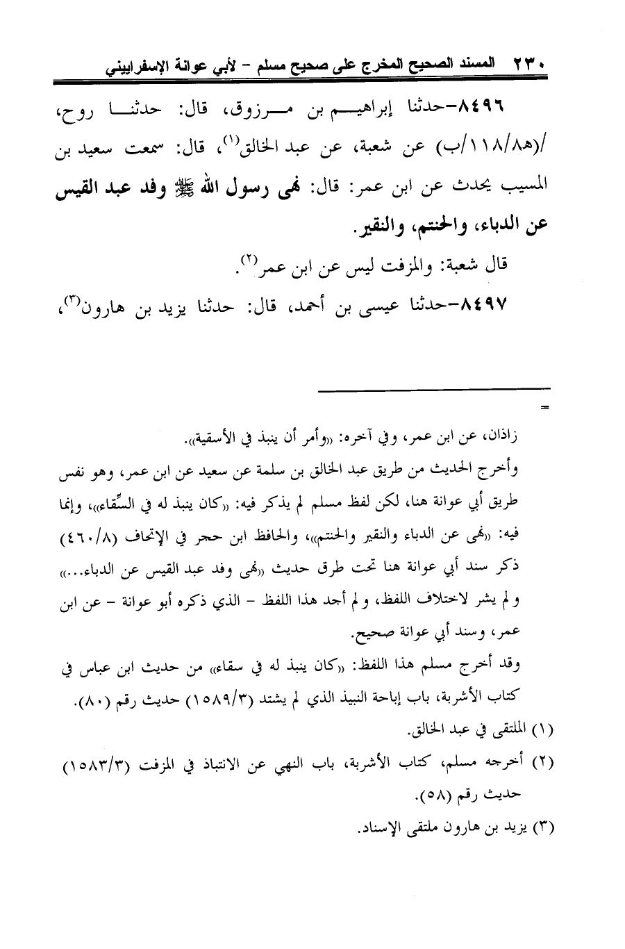 8496 - حدثنا إبراهيم بن مرزوق، قال: حدثنا روح، عن شعبة، عن عبد الخالق (¬1)، قال: سمعت سعيد بن المسيب يحدث عن ابن عمر: قال: نهى رسول الله -صلى الله عليه وسلم- وفد عبد القيس عن الدباء، والحنتم، والنقير.
