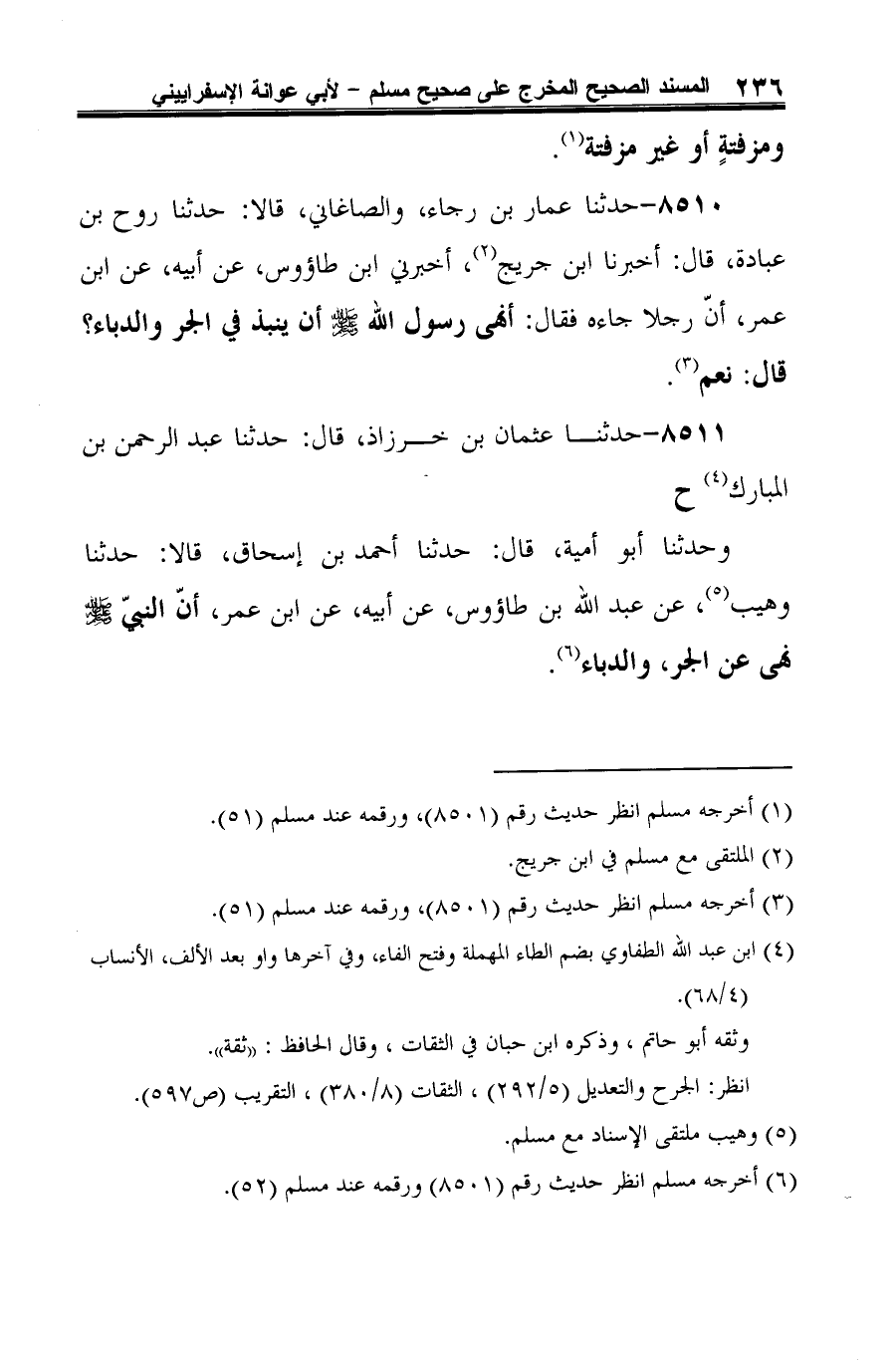 8510 - حدثنا عمار بن رجاء، والصاغاني، قالا: حدثنا روح بن عبادة، قال: أخبرنا ابن جُريج (¬1)، أخبرني ابن طاؤوس، عن أبيه، عن ابن عمر، أنّ رجلًا جاءه فقال: أنهى رسول الله -صلى الله عليه وسلم- أن ينبذ في الجر والدباء؟ قال: نعم (¬2).