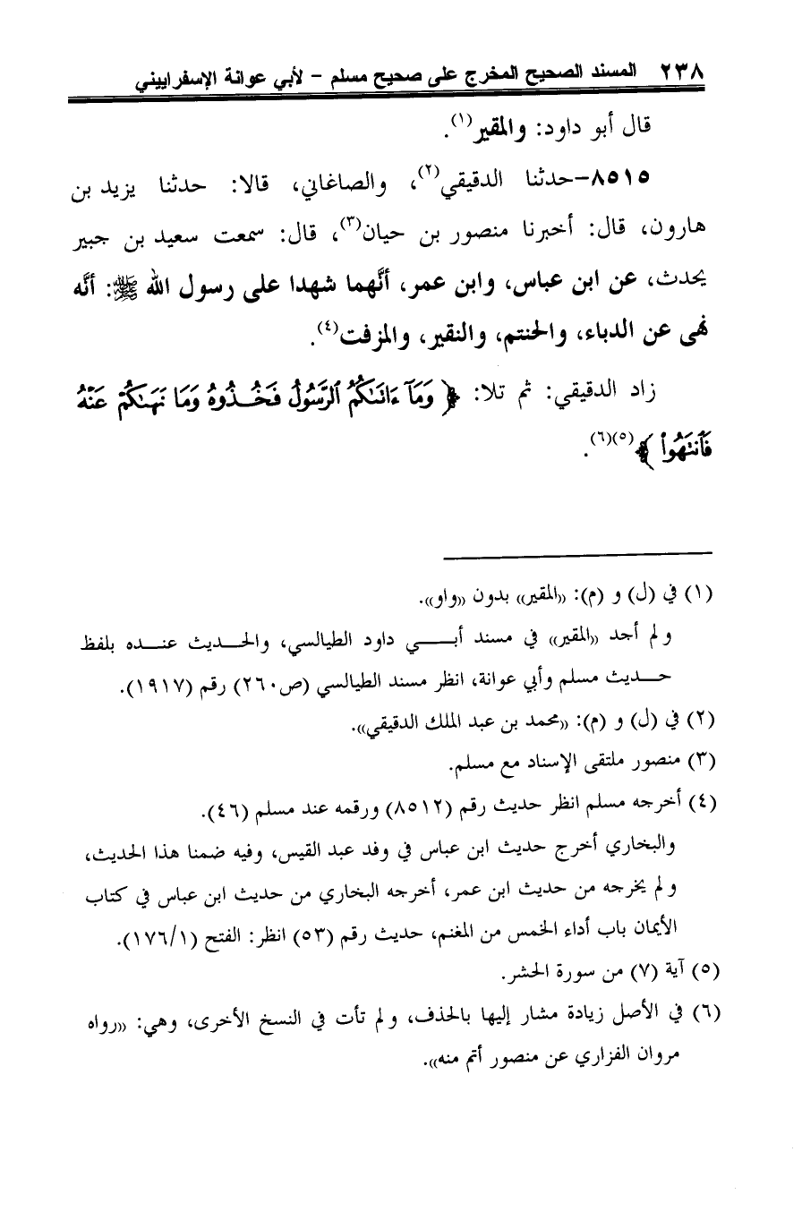 8515 - حدثنا الدقيقي (¬1)، والصاغاني، قالا: حدثنا يزيد بن هارون، قال: أخبرنا منصور بن حيان (¬2)، قال: سمعت سعيد بن جبير يحدث، عن ابن عباس، وابن عمر، أنَّهما شهدا على رسول الله -صلى الله عليه وسلم-: أنَّه نهى عن الدباء، والحنتم، والنقير، والمزفت (¬3).