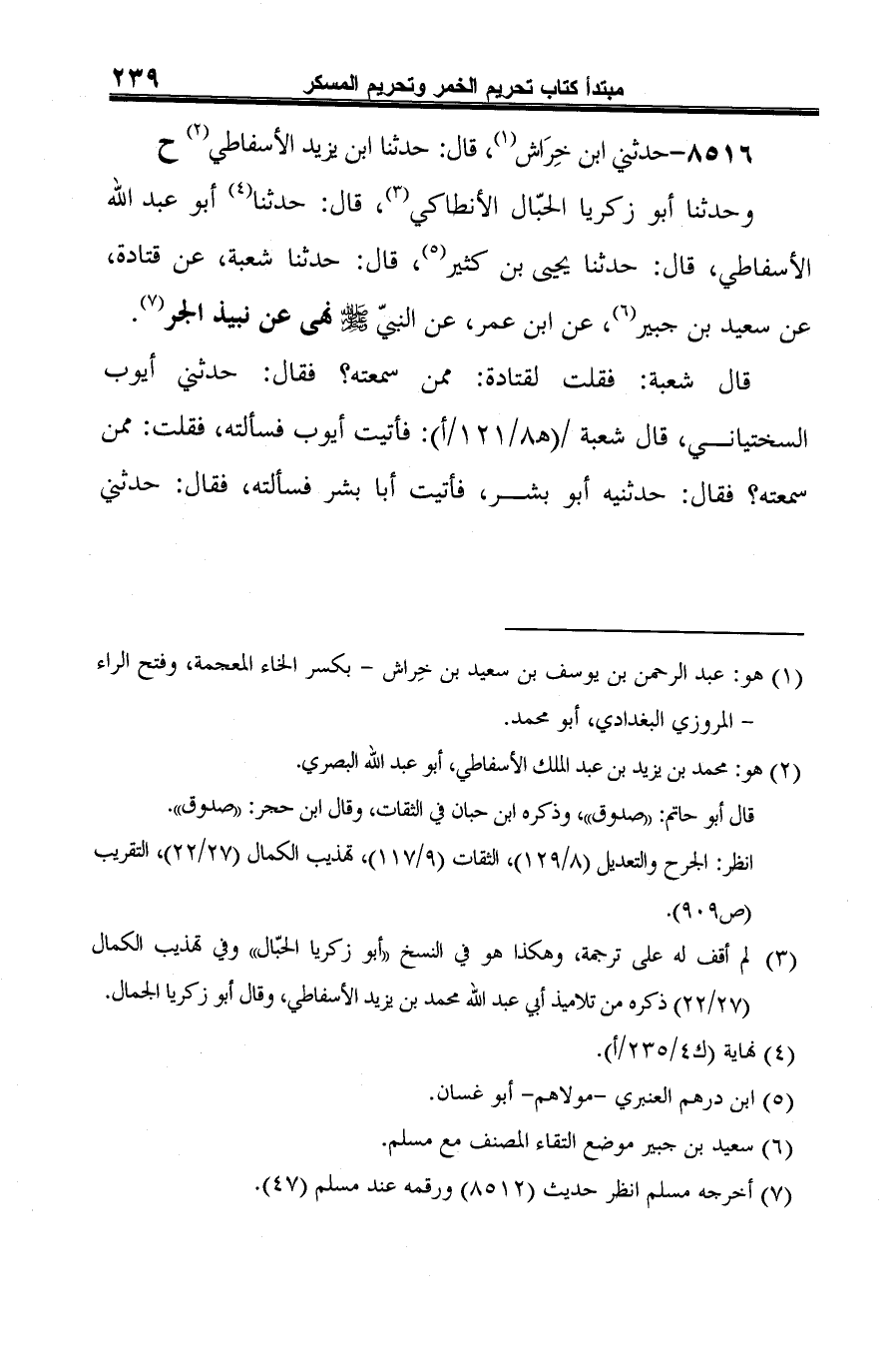 وحدثنا أبو زكريا الحبّال الأنطاكي (¬3)، قال: حدثنا (¬4) أبو عبد الله الأسفاطي، قال: حدثنا يحيى بن كثير (¬5)، قال: حدثنا شعبة، عن قتادة، عن سعيد بن جبير (¬6)، عن ابن عمر، عن النبيّ -صلى الله عليه وسلم- نهى عن نبيذ الجر (¬7).